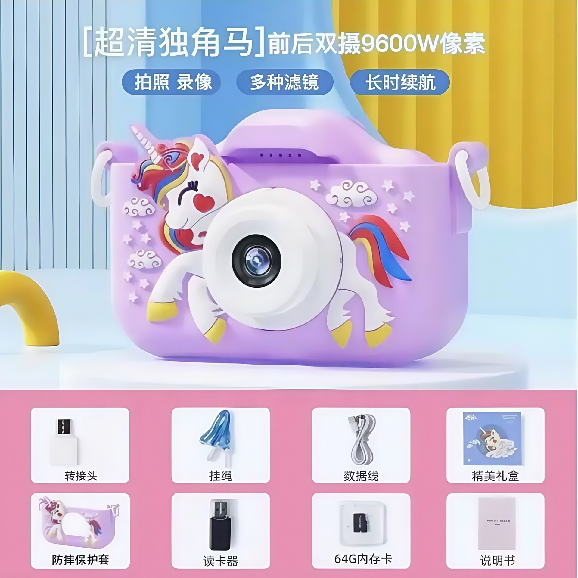 • (유니콘 핑크) HD 듀얼 카메라 9600W 64G 메모리 카드