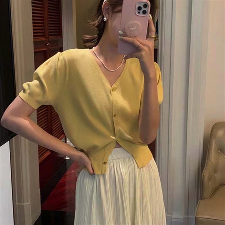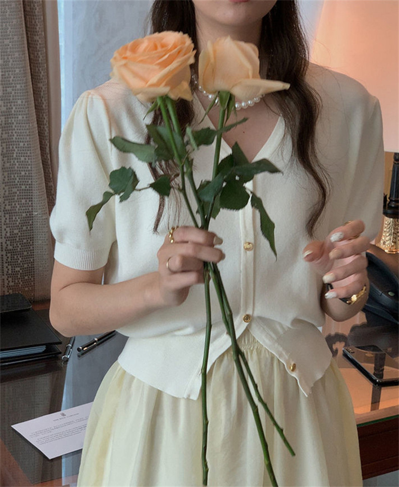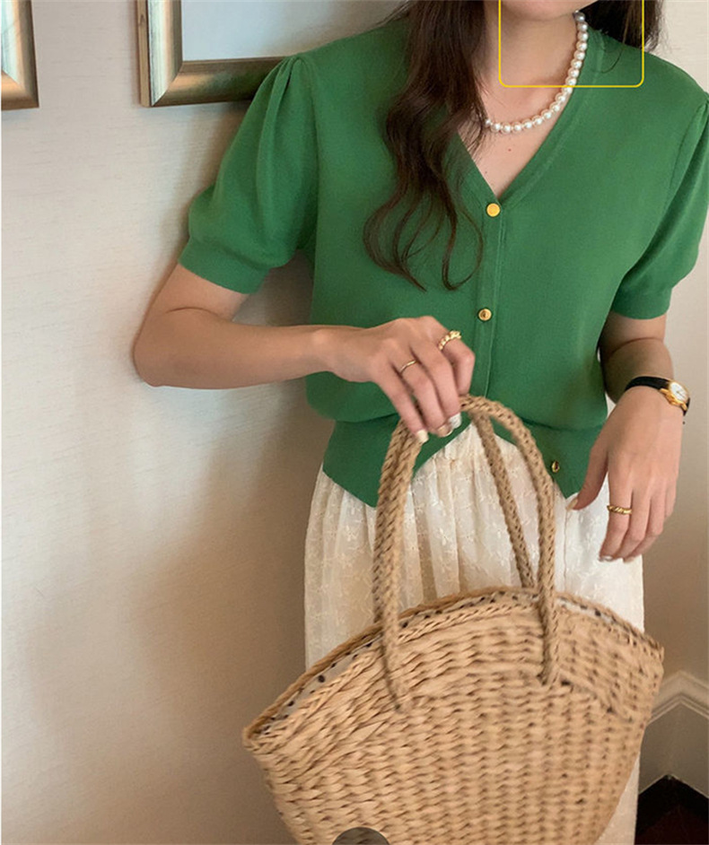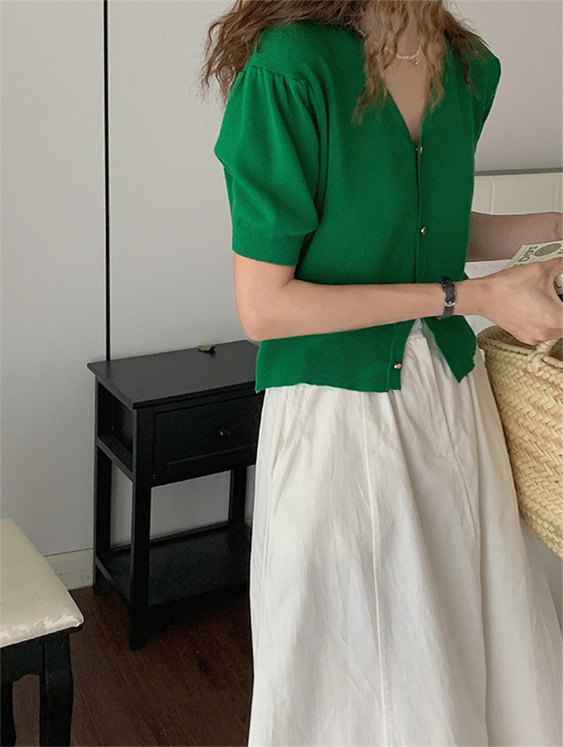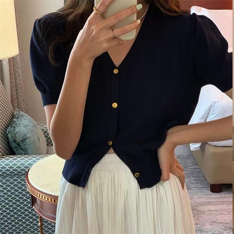 프랑스 레트로 하이 엔드 웨스턴 스타일 우아한 반팔 V 넥 퍼프 슬리브 반팔 여성용 스웨터 카디건 티셔츠 탑 여름