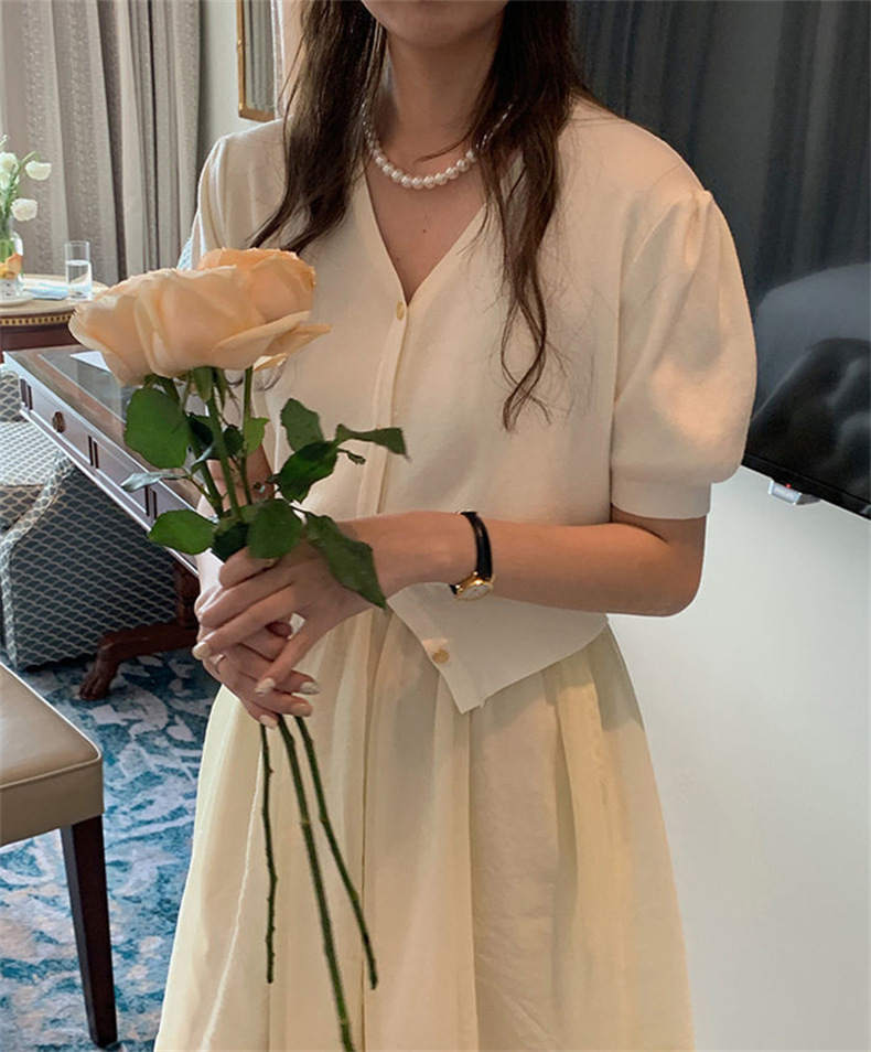 프랑스 레트로 하이 엔드 웨스턴 스타일 우아한 반팔 V 넥 퍼프 슬리브 반팔 여성용 스웨터 카디건 티셔츠 탑 여름스토어 가기