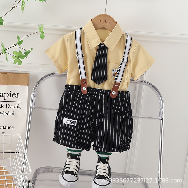 소년 영국 아동복 여름 새로운 어린이 넥타이 크라운 어깨 스트랩 바지 소년 짧은 소매 투피스 세트 도매스토어 가기