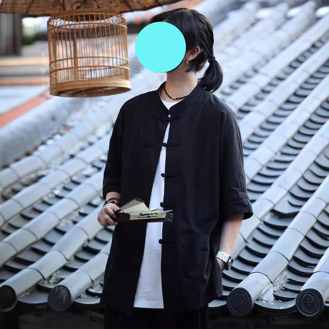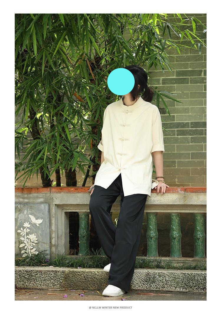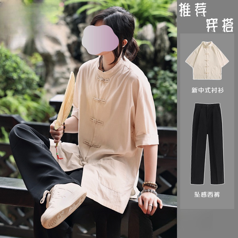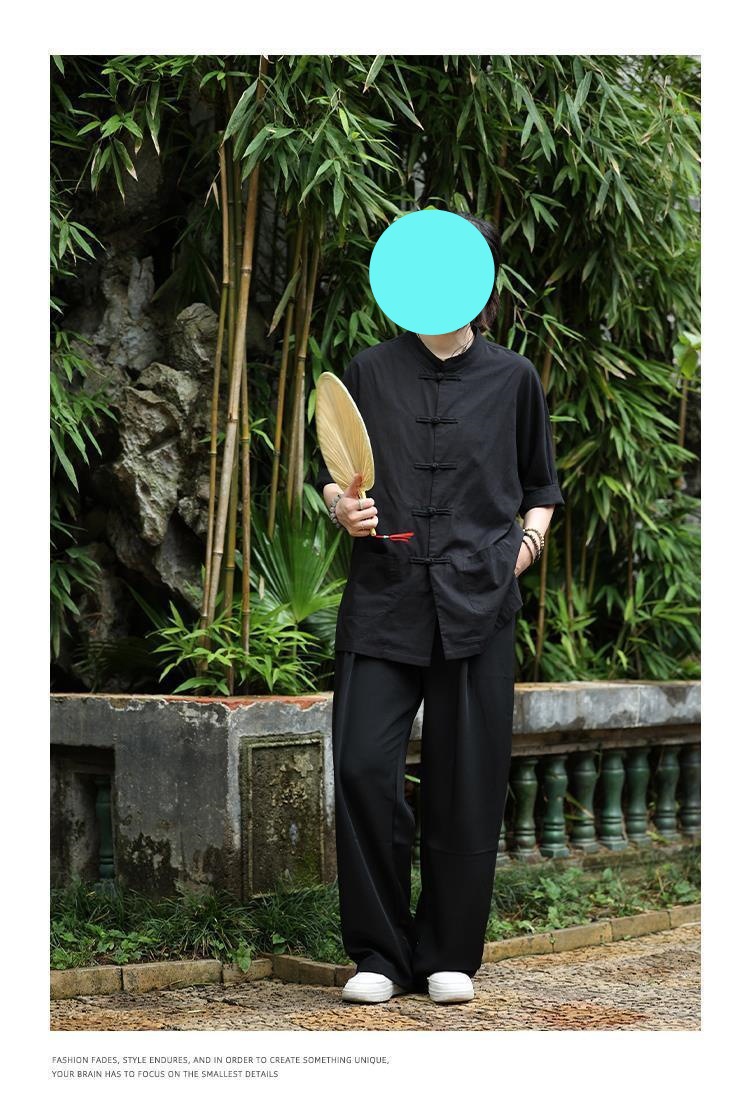 2 피스 블랙 셔츠 탕 세트 유니섹스 스타일 반팔 셔츠 세트 바지 세트 새로운 중국 스타일 남성 국가 스타일스토어 가기