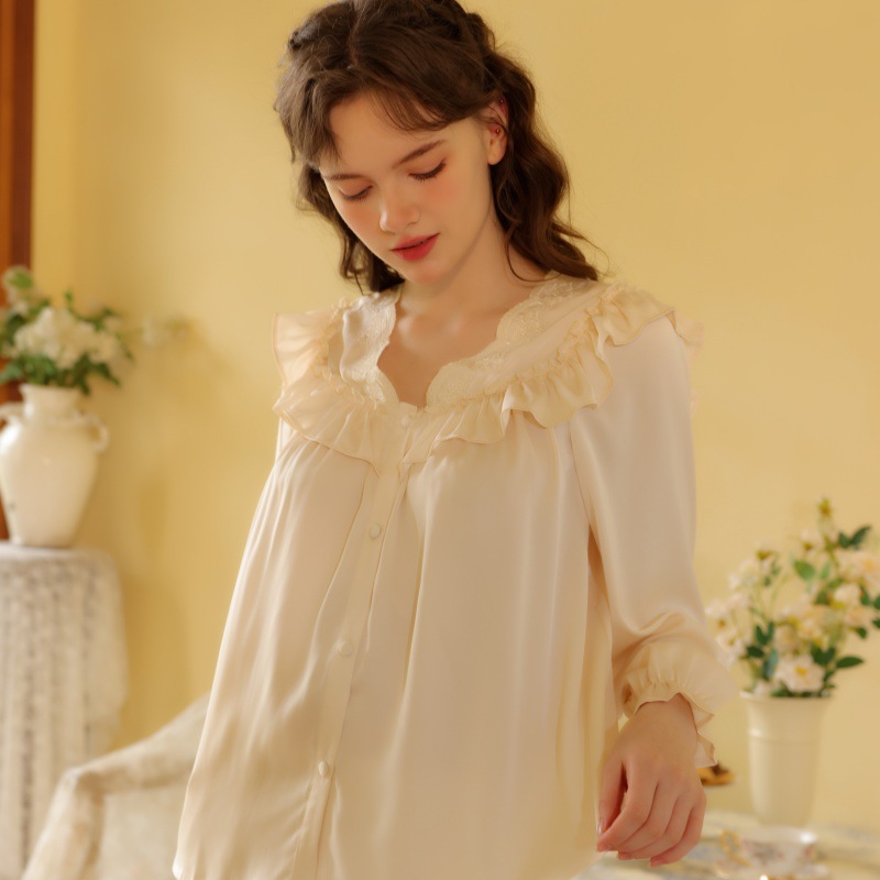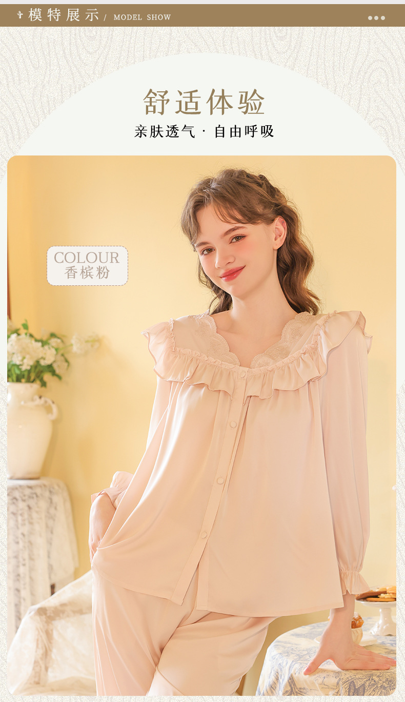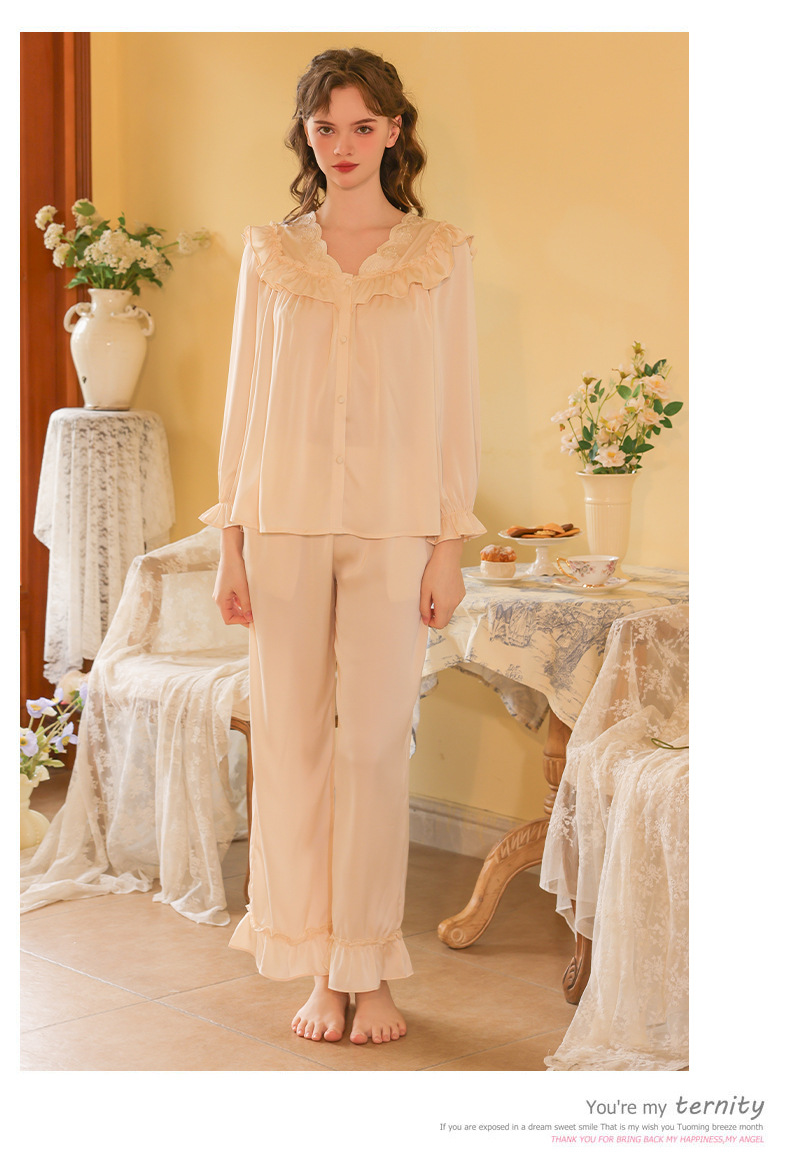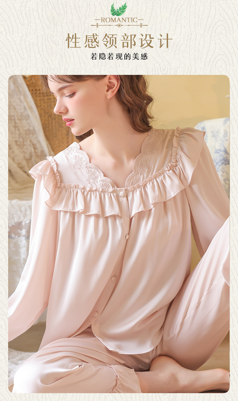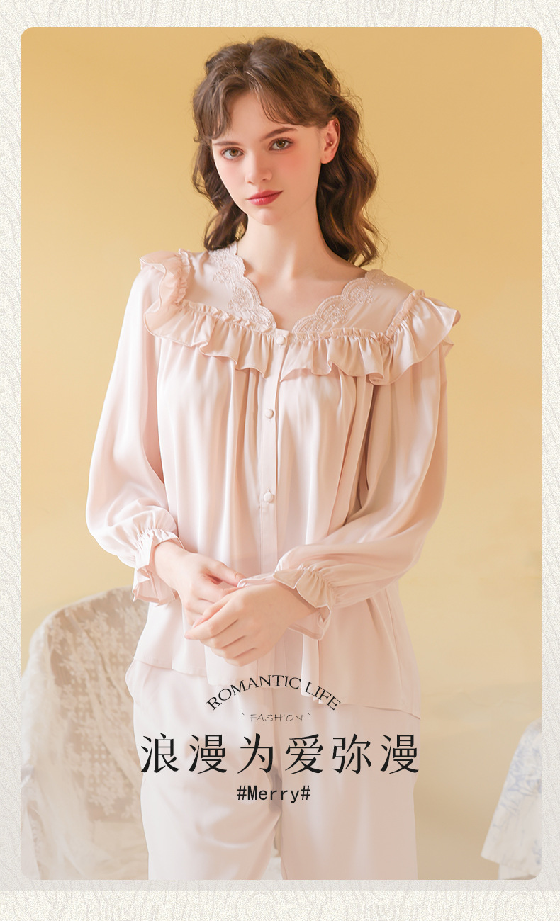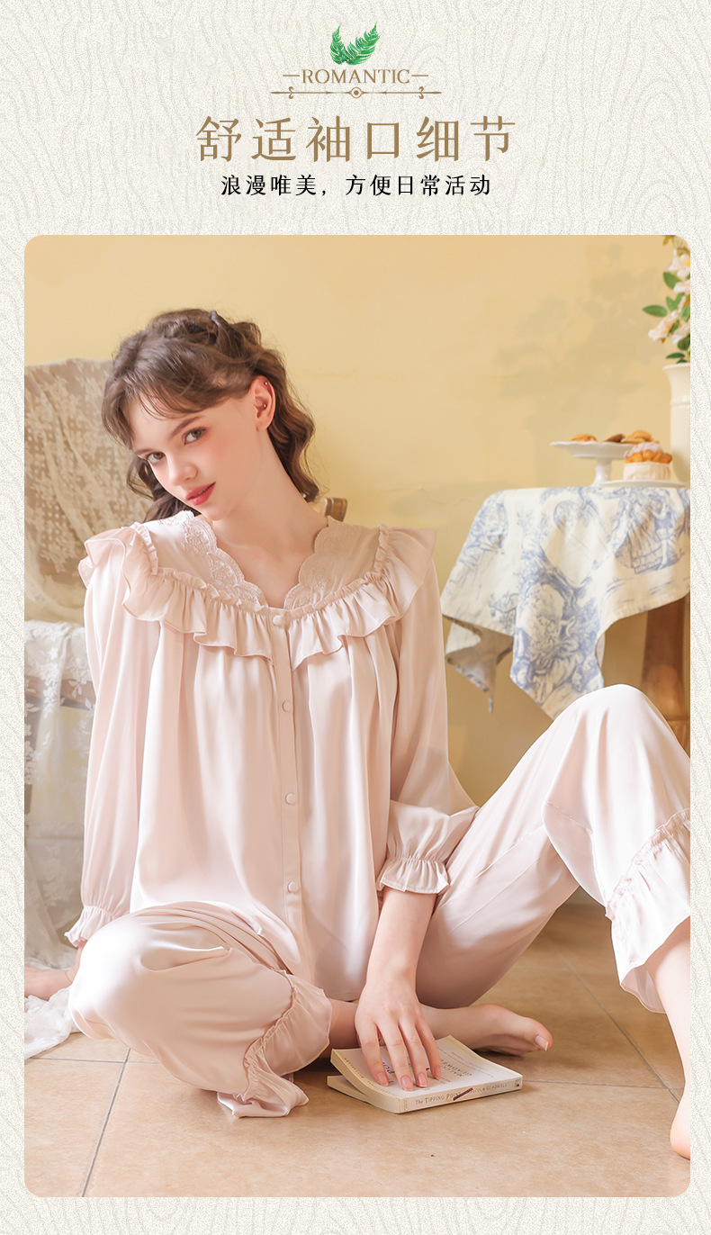 잠옷 여성의 봄과 가을 긴팔 바지 아이스 실크 새틴 자수 하이 엔드 센스 달콤한 인터넷 추적 스타일 홈 의류 세트