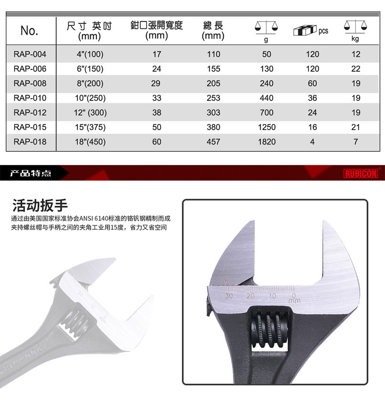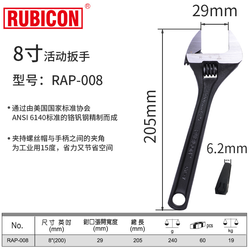 일본 루비 콘 로빈 후드 대형 오픈 엔드 조정 가능한 렌치 배관 욕실 렌치 RBV-006/8/012