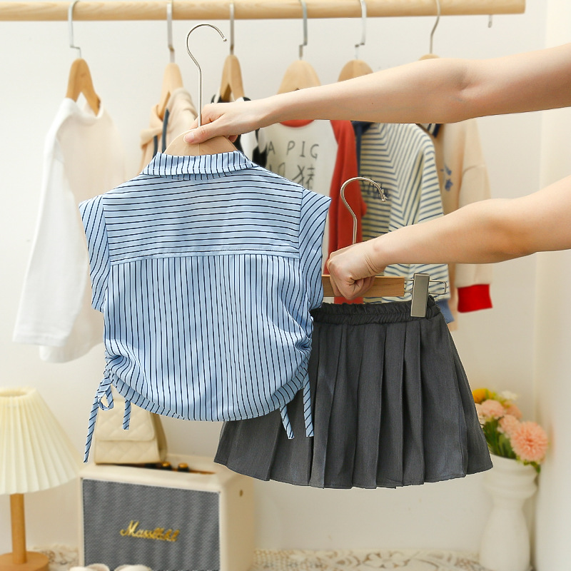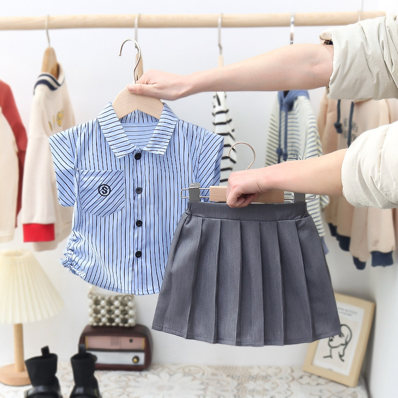 소녀 여름 셔츠 세트 대외 무역 새로운 여름 스타일 어린이 수직 셔츠 + 플리츠 스커트 2 피스 세트 유행스토어 가기