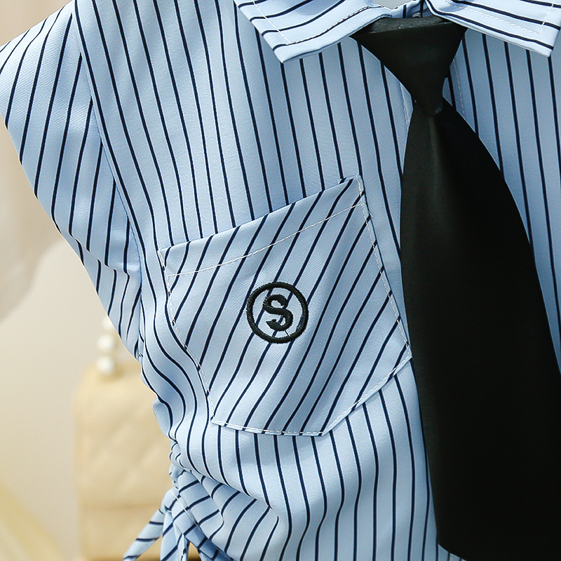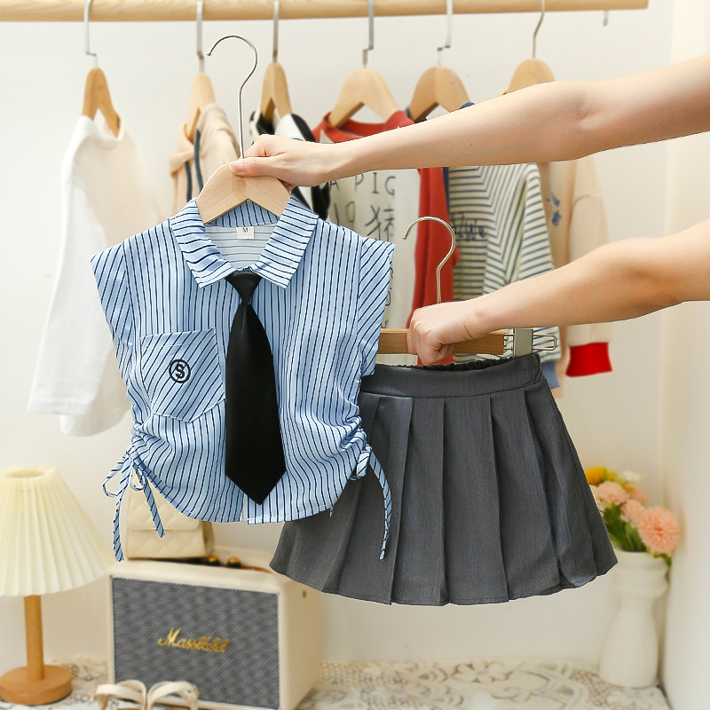 소녀 여름 셔츠 세트 대외 무역 새로운 여름 스타일 어린이 수직 셔츠 + 플리츠 스커트 2 피스 세트 유행