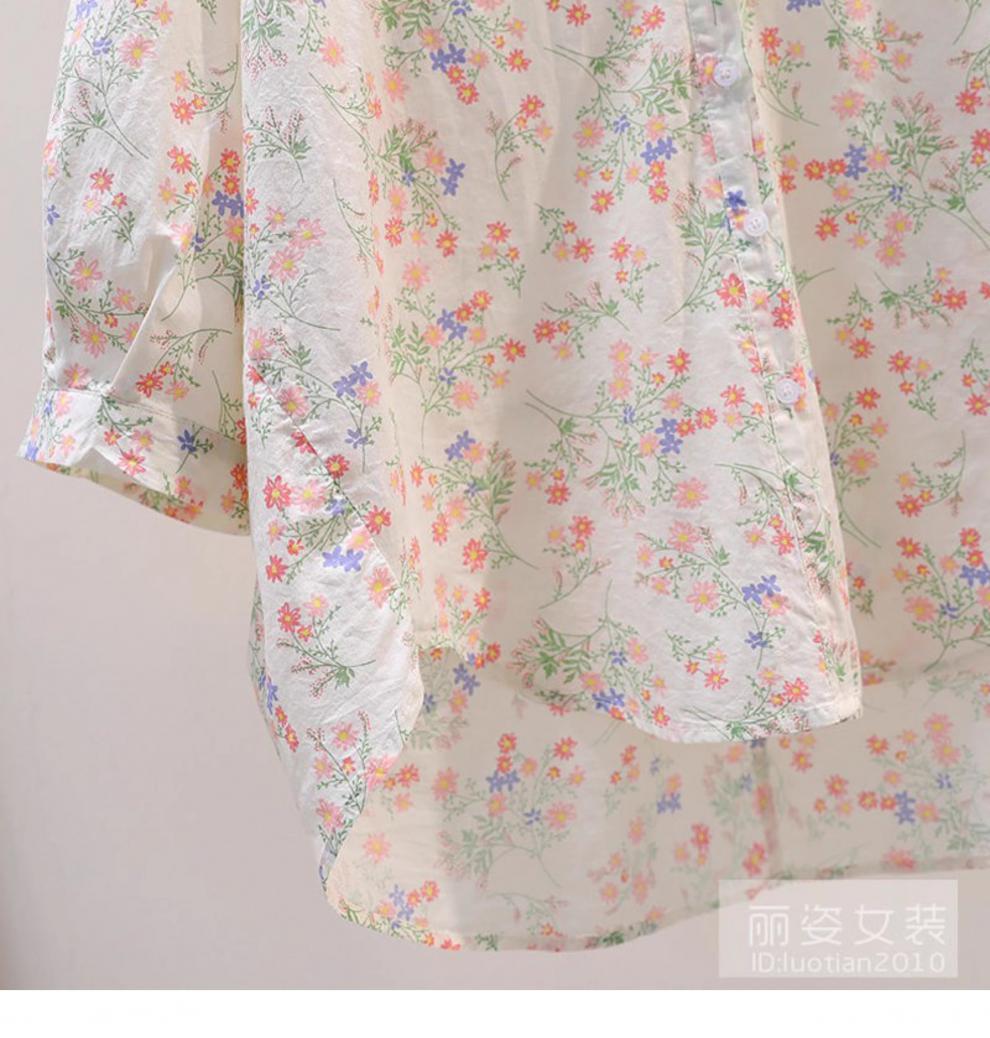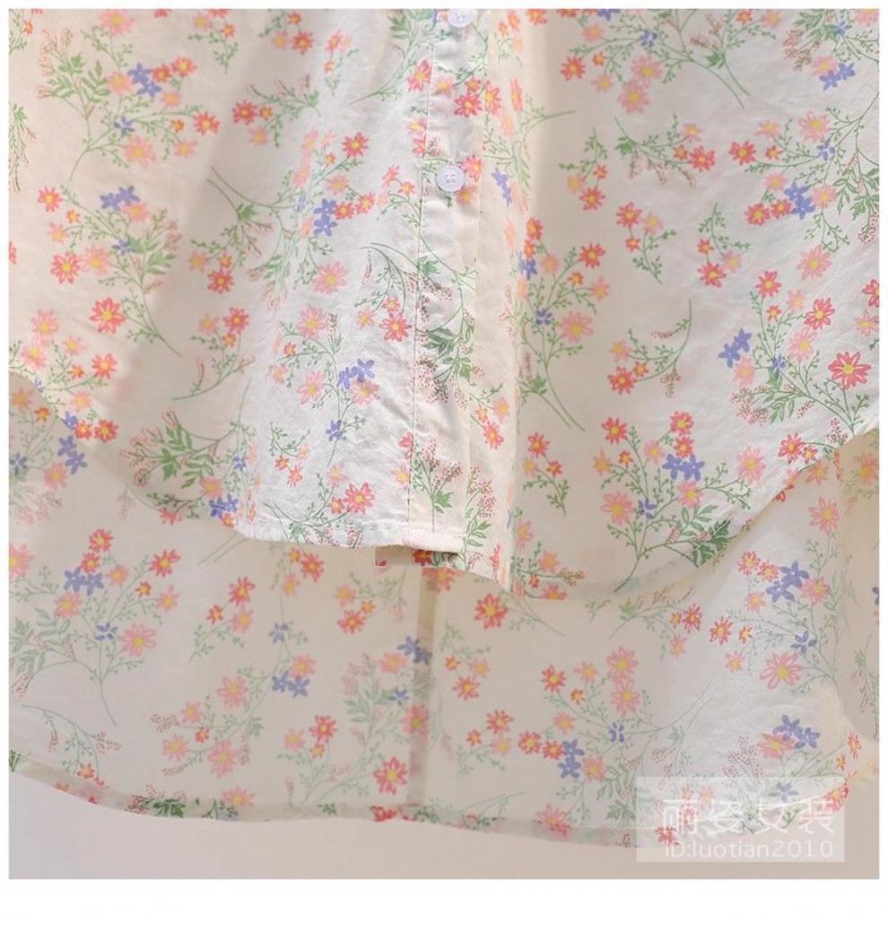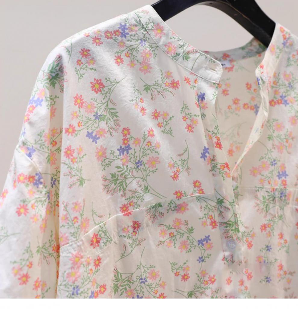 라운드 넥 작은 꽃 무늬 코튼 셔츠 여성 홍콩 스타일 복고풍 루즈 캐주얼 셔츠 2025 여름 7부 소매 탑