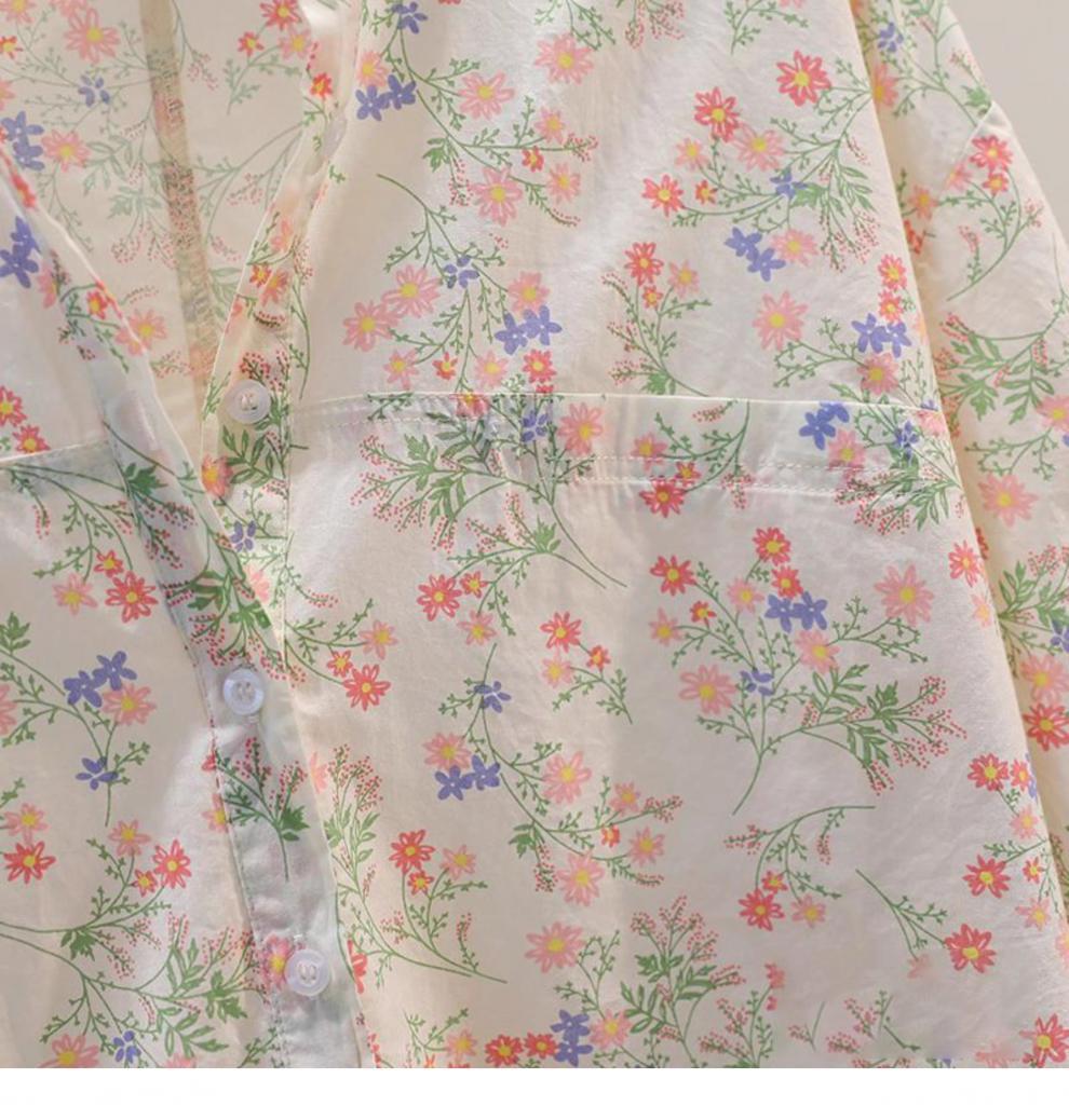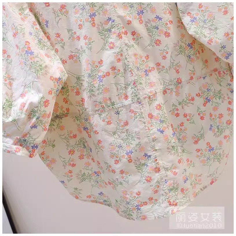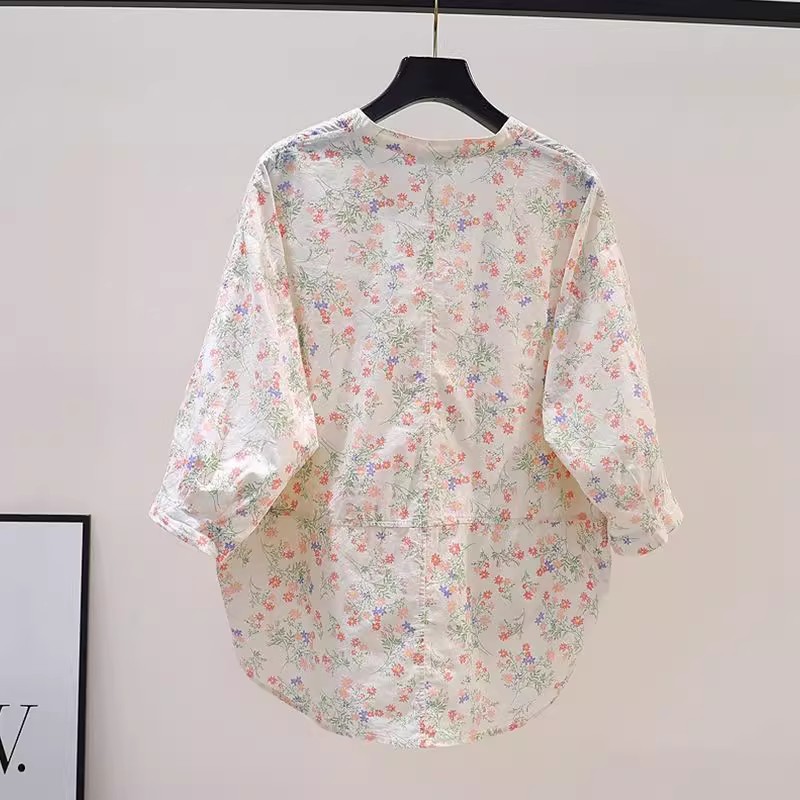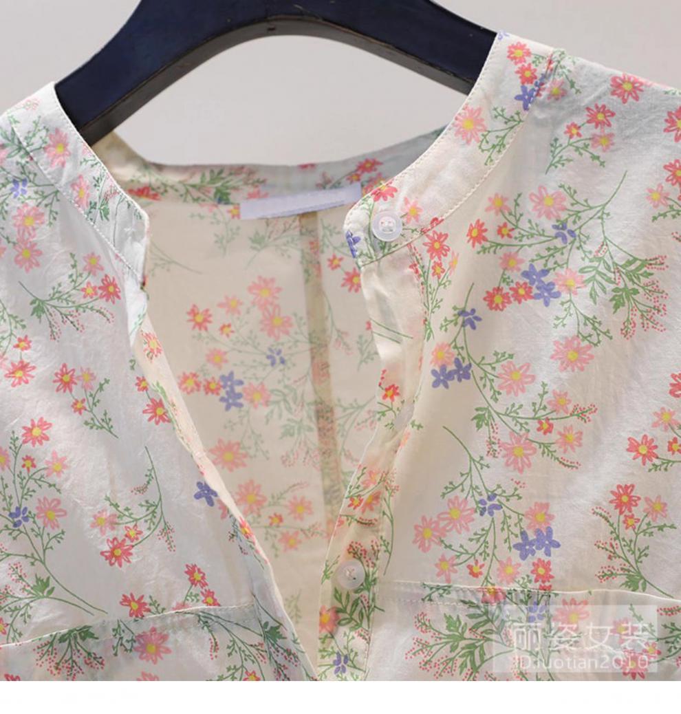 라운드 넥 작은 꽃 무늬 코튼 셔츠 여성 홍콩 스타일 복고풍 루즈 캐주얼 셔츠 2025 여름 7부 소매 탑