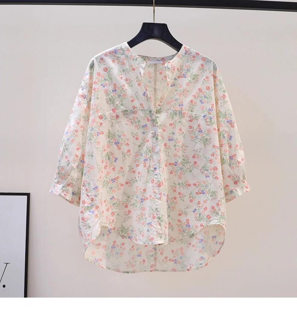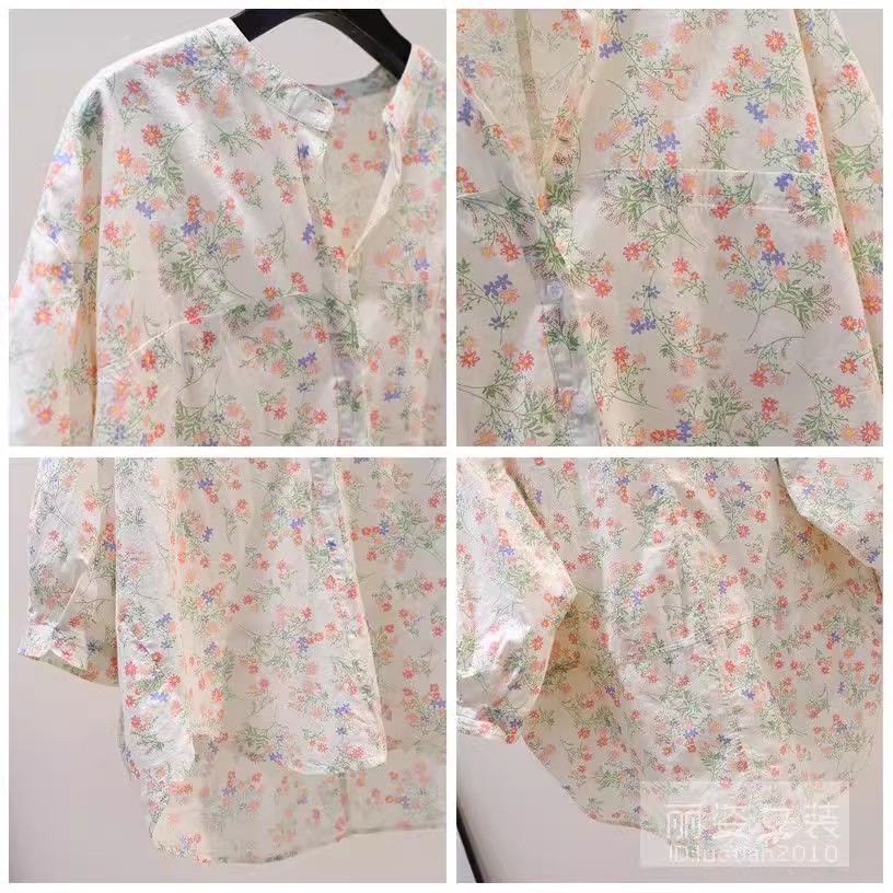 라운드 넥 작은 꽃 무늬 코튼 셔츠 여성 홍콩 스타일 복고풍 루즈 캐주얼 셔츠 2025 여름 7부 소매 탑스토어 가기