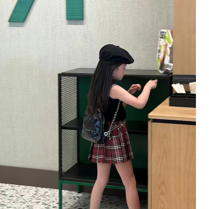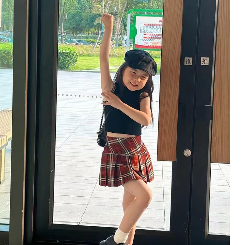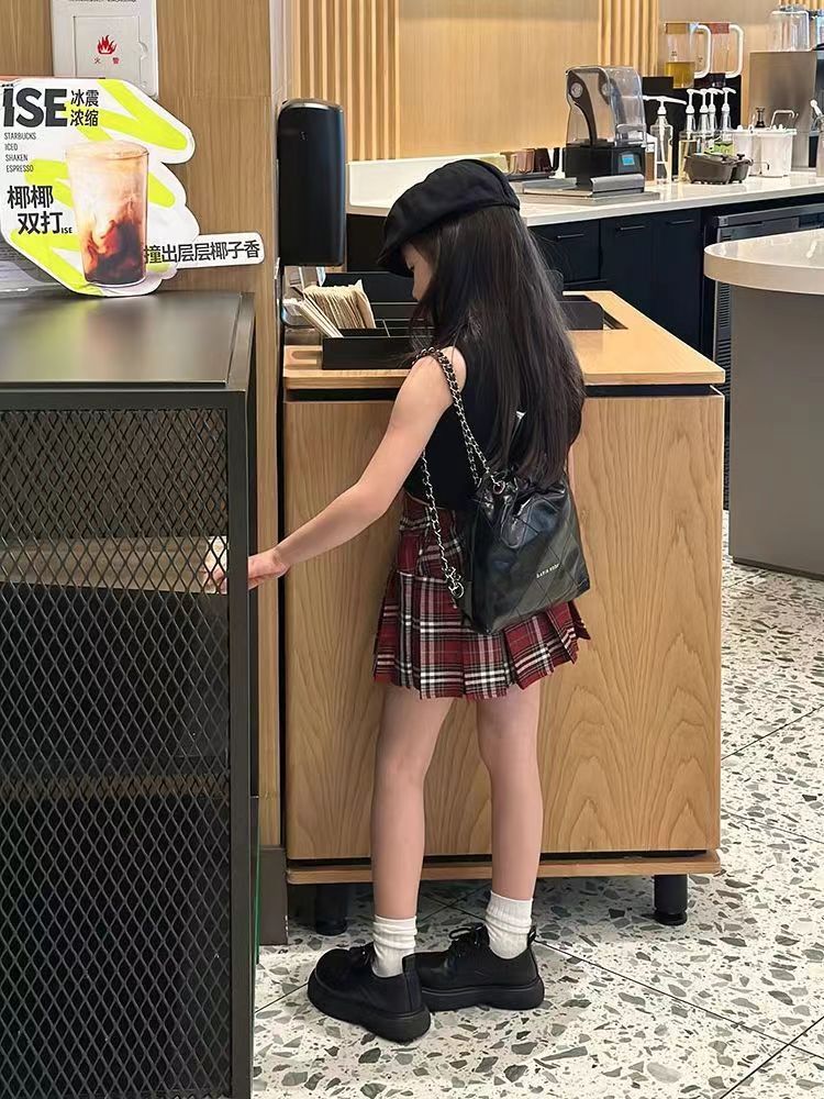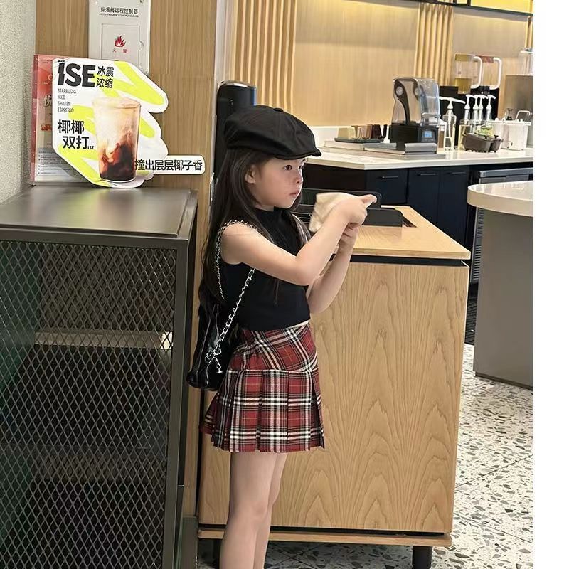 2024 여자 여름 세트 여자 세련된 블랙 조끼 최고 어린이 유행 우아한 빨간 치마 세트
