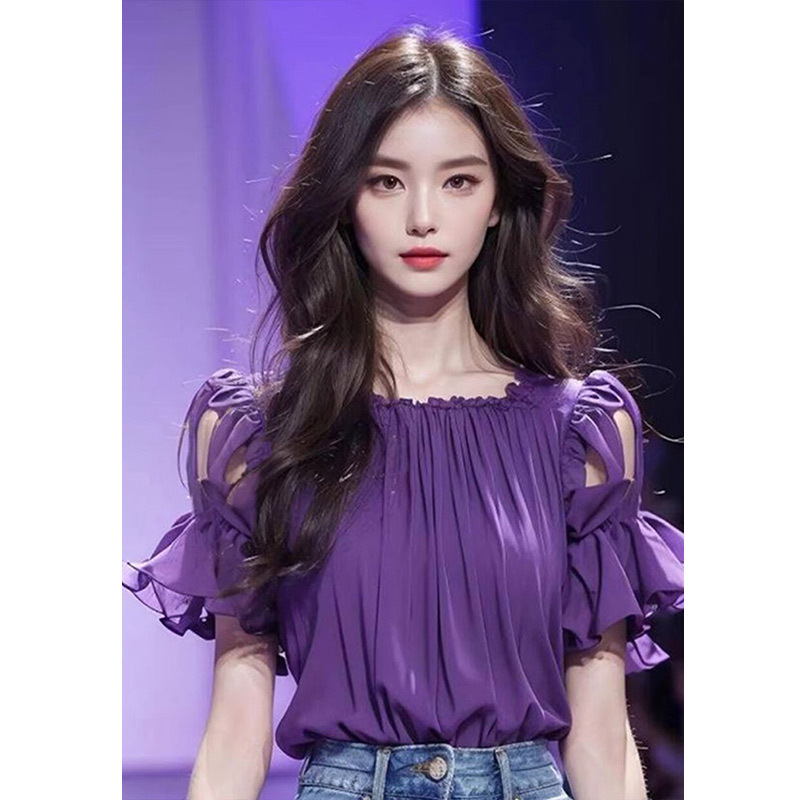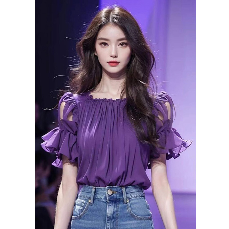 2024 새로운 여름 보라색 쉬폰 셔츠 디자인 중공 살을 덮는 세련된 달콤한 슬리밍 풀오버 탑스토어 가기