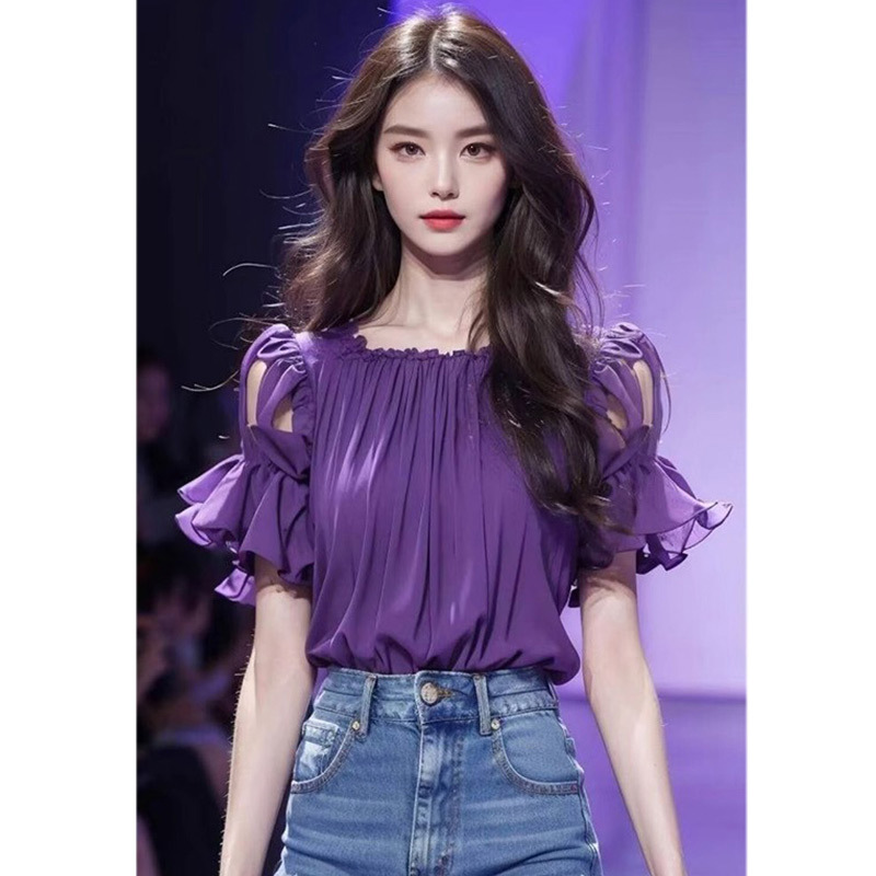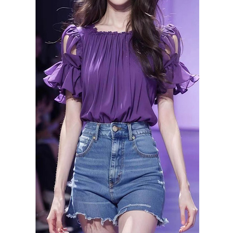 2024 새로운 여름 보라색 쉬폰 셔츠 디자인 중공 살을 덮는 세련된 달콤한 슬리밍 풀오버 탑