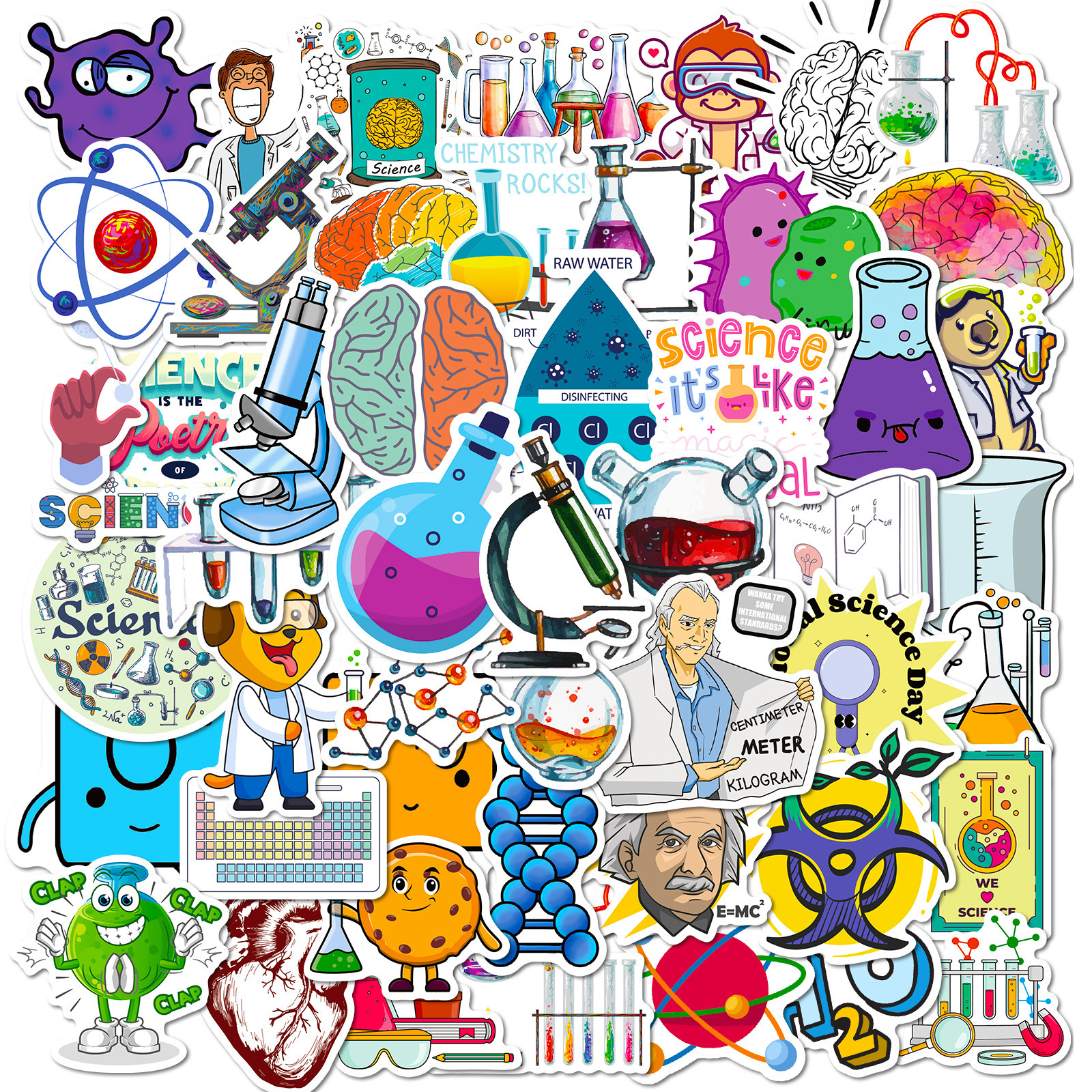50 개의 실험 장치 스티커 물리적 및 화학 장비 만화 스티커 약사 화학 방정식 성격 스티커스토어 가기