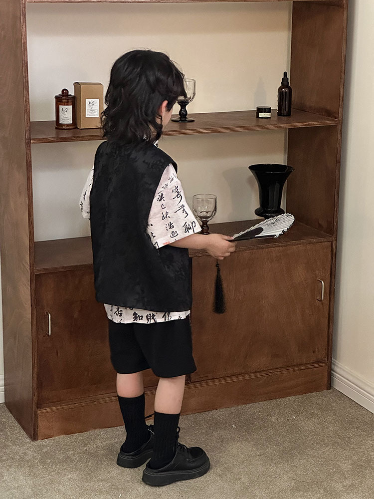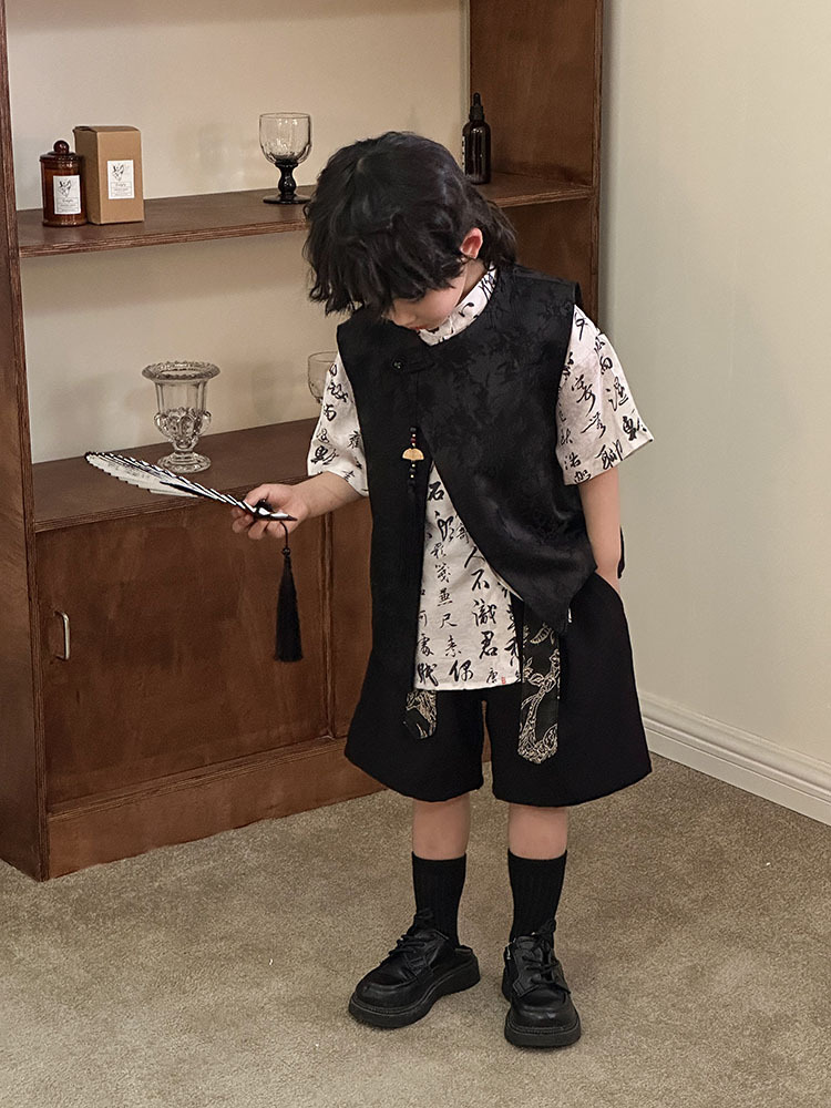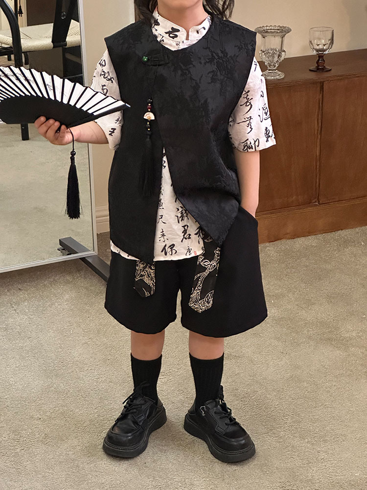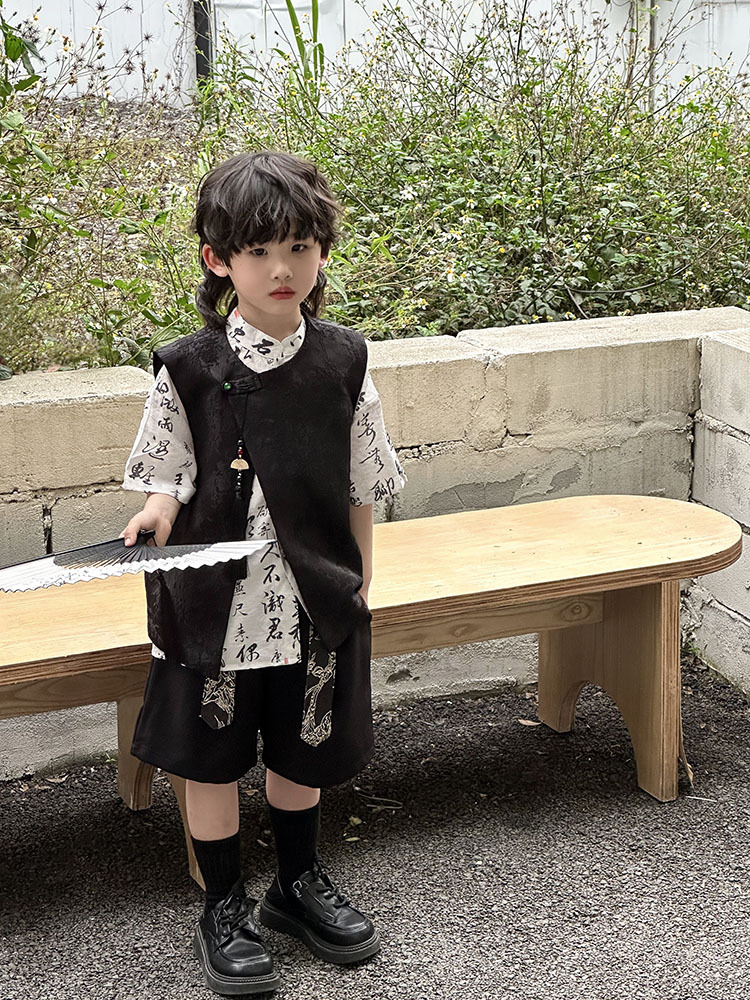 어린이 자카드 조끼 반팔 셔츠 세트 2025 여름 신상품 새로운 중국 스타일 남아 여름옷 한복 트렌드스토어 가기