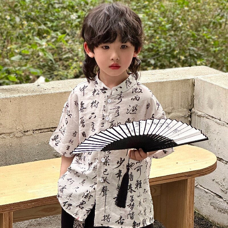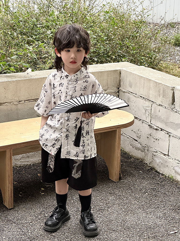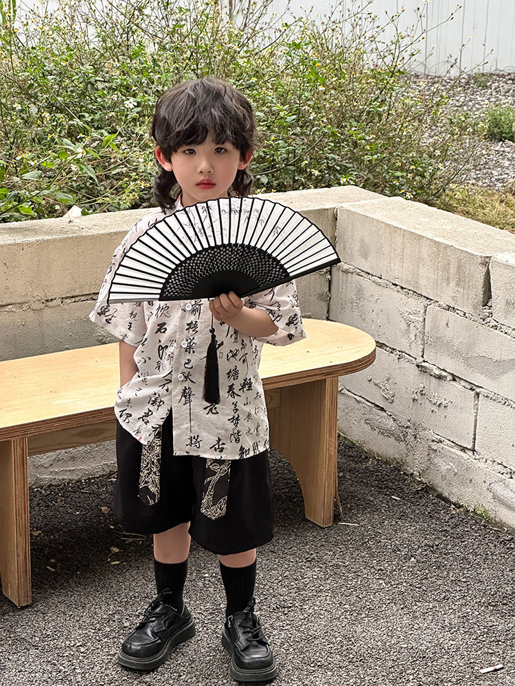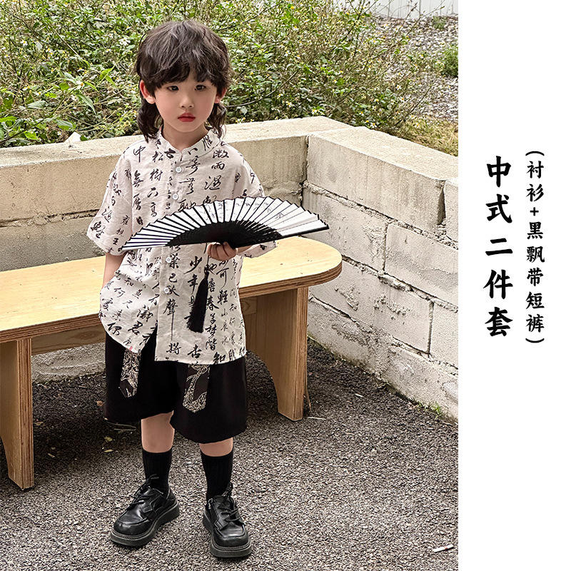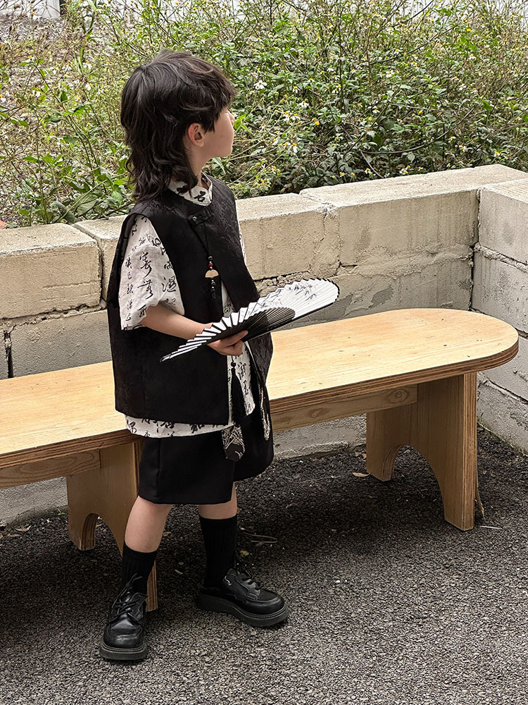 어린이 자카드 조끼 반팔 셔츠 세트 2025 여름 신상품 새로운 중국 스타일 남아 여름옷 한복 트렌드스토어 가기