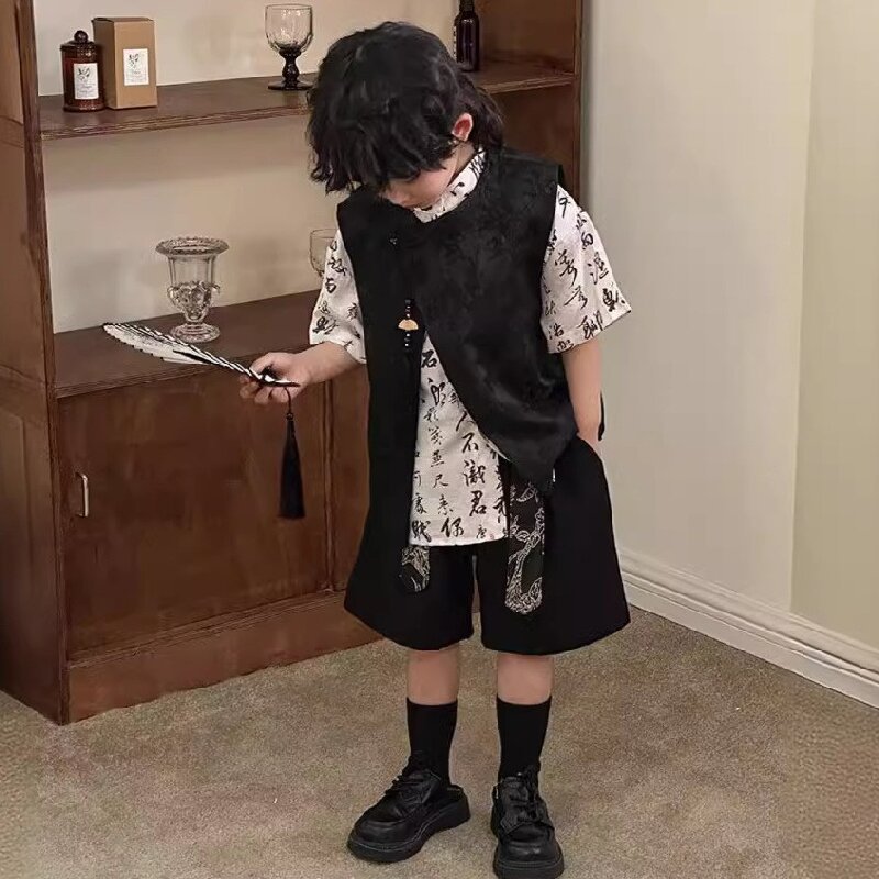 어린이 자카드 조끼 반팔 셔츠 세트 2025 여름 신상품 새로운 중국 스타일 남아 여름옷 한복 트렌드
