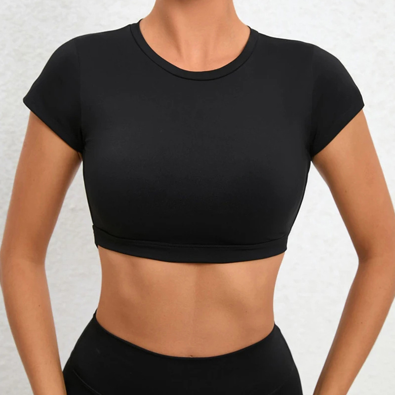 유럽과 미국의 섹시한 스포츠 반팔 티셔츠 여성용 솔리드 컬러 라운드 넥 타이트 백리스 탑 아마존 AliExpress 소스 배치 F스토어 가기