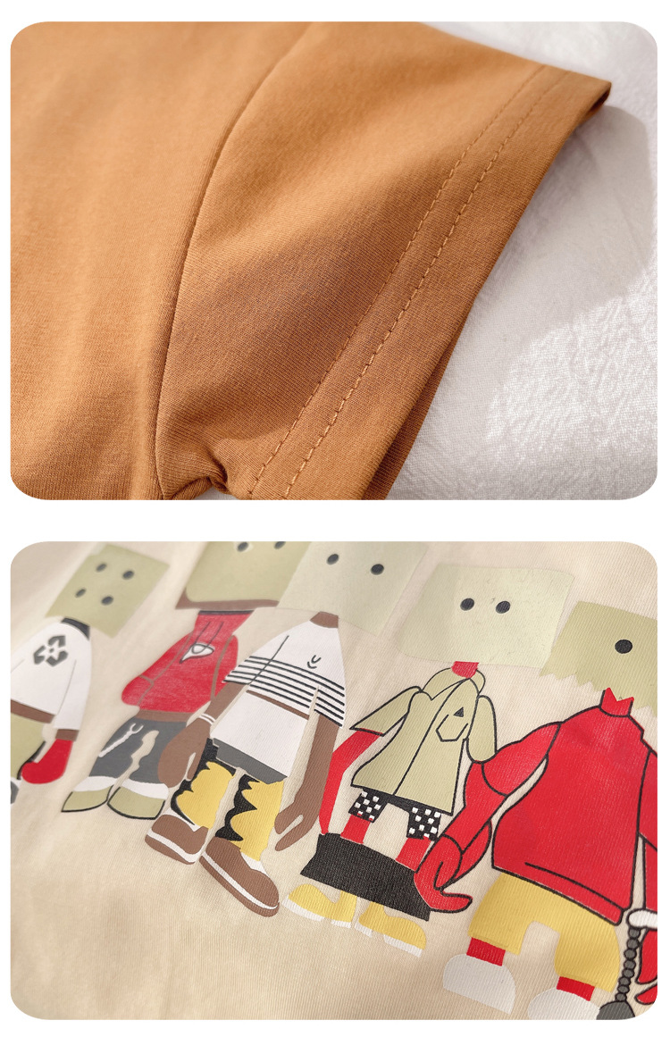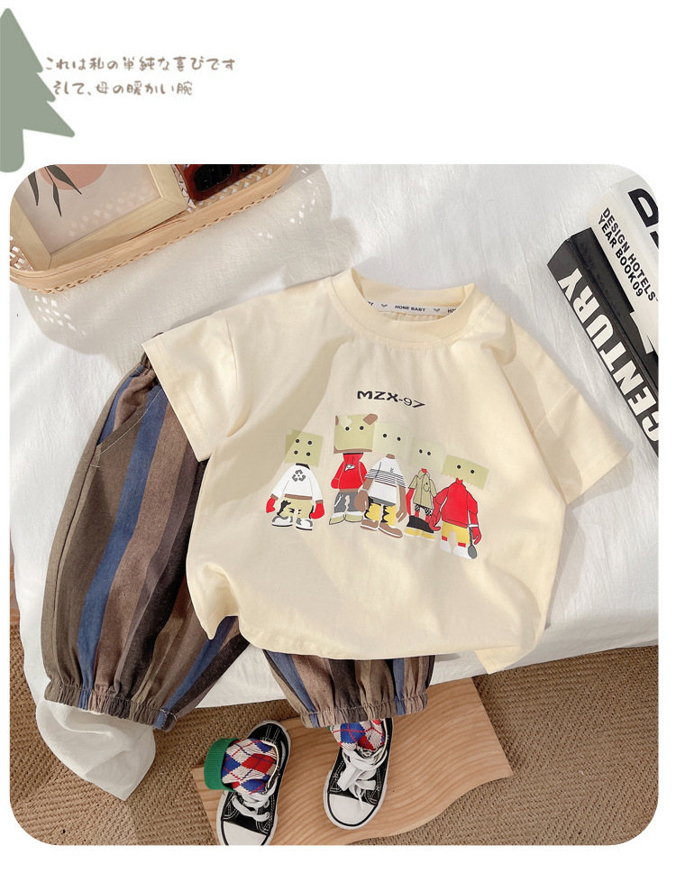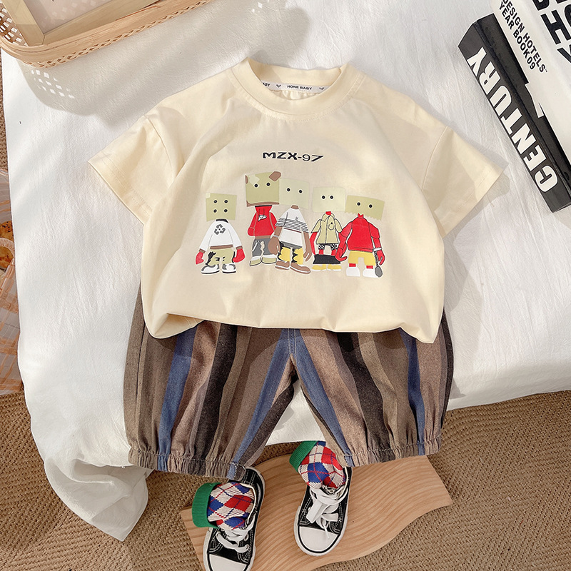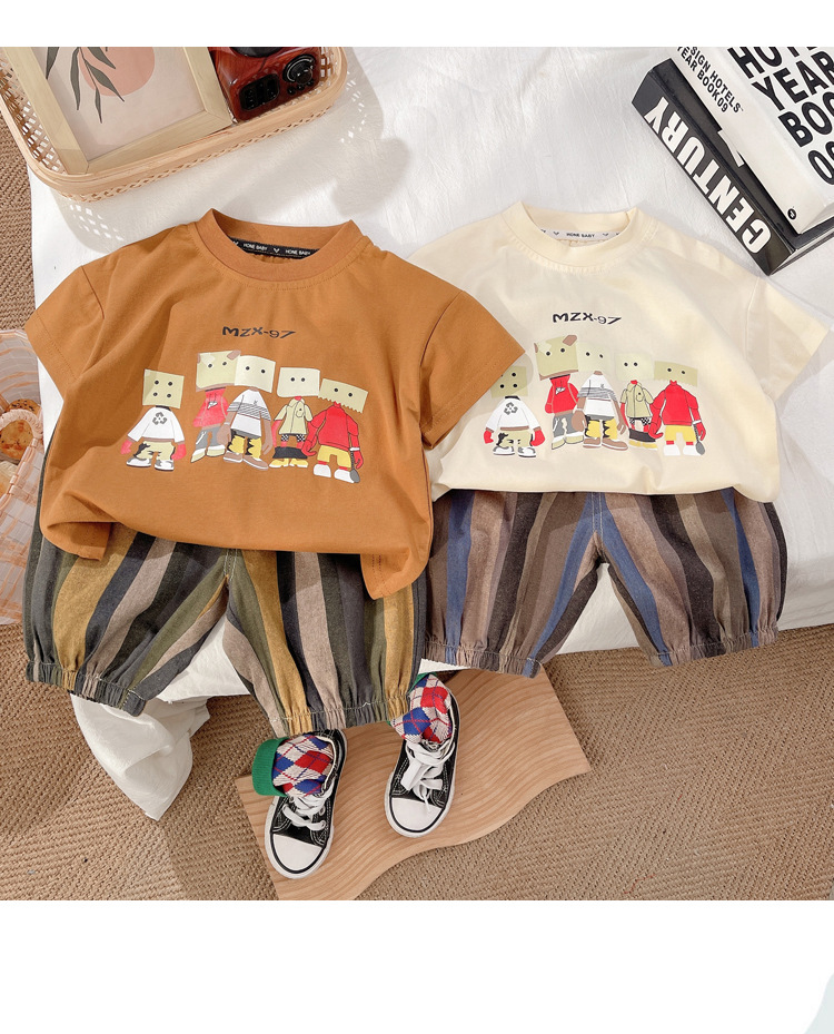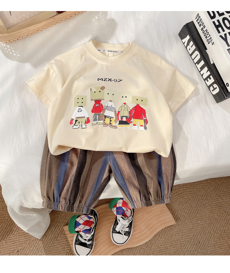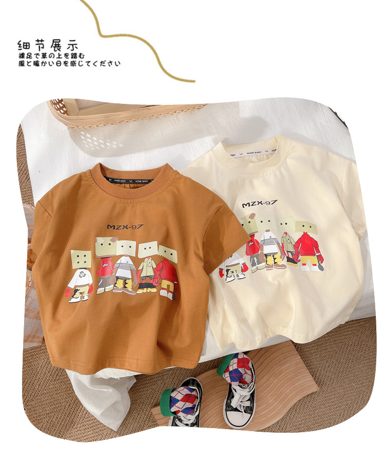 소년 반팔 티셔츠 여름 소녀 로봇 진한 베이지 컬러 하프 소매 얇은 상단 어린이 세트 도매스토어 가기