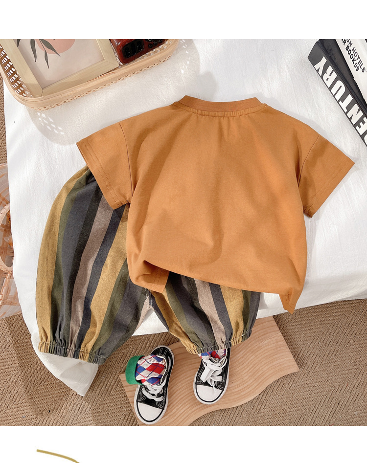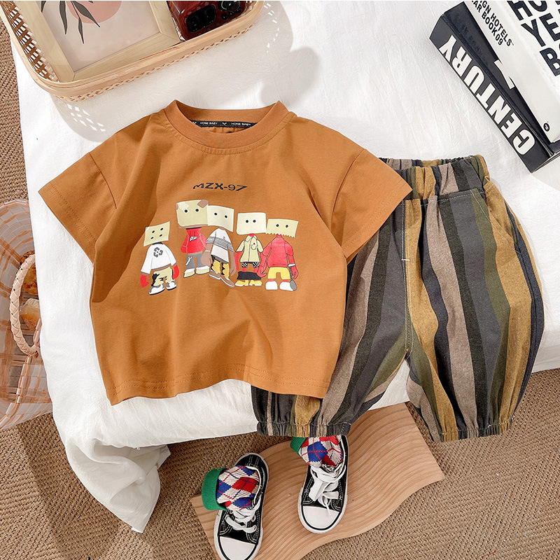 소년 반팔 티셔츠 여름 소녀 로봇 진한 베이지 컬러 하프 소매 얇은 상단 어린이 세트 도매