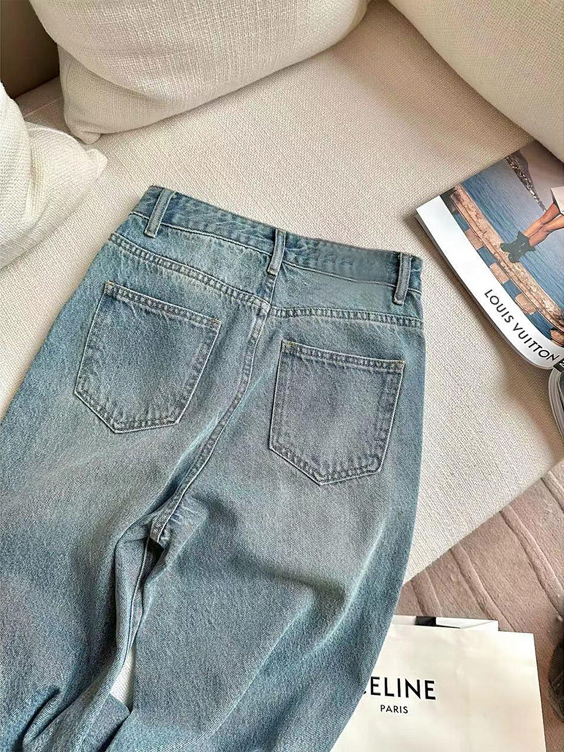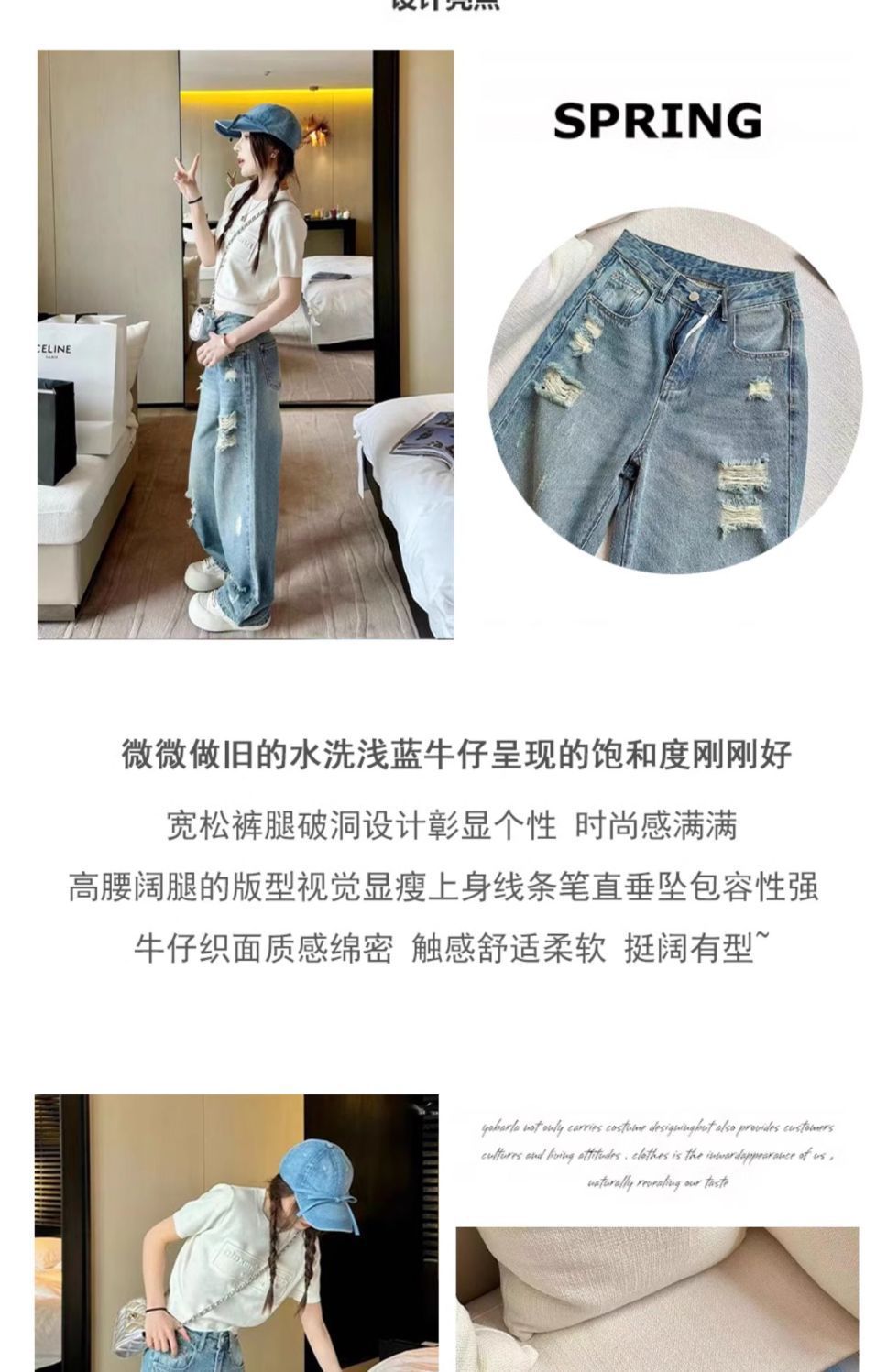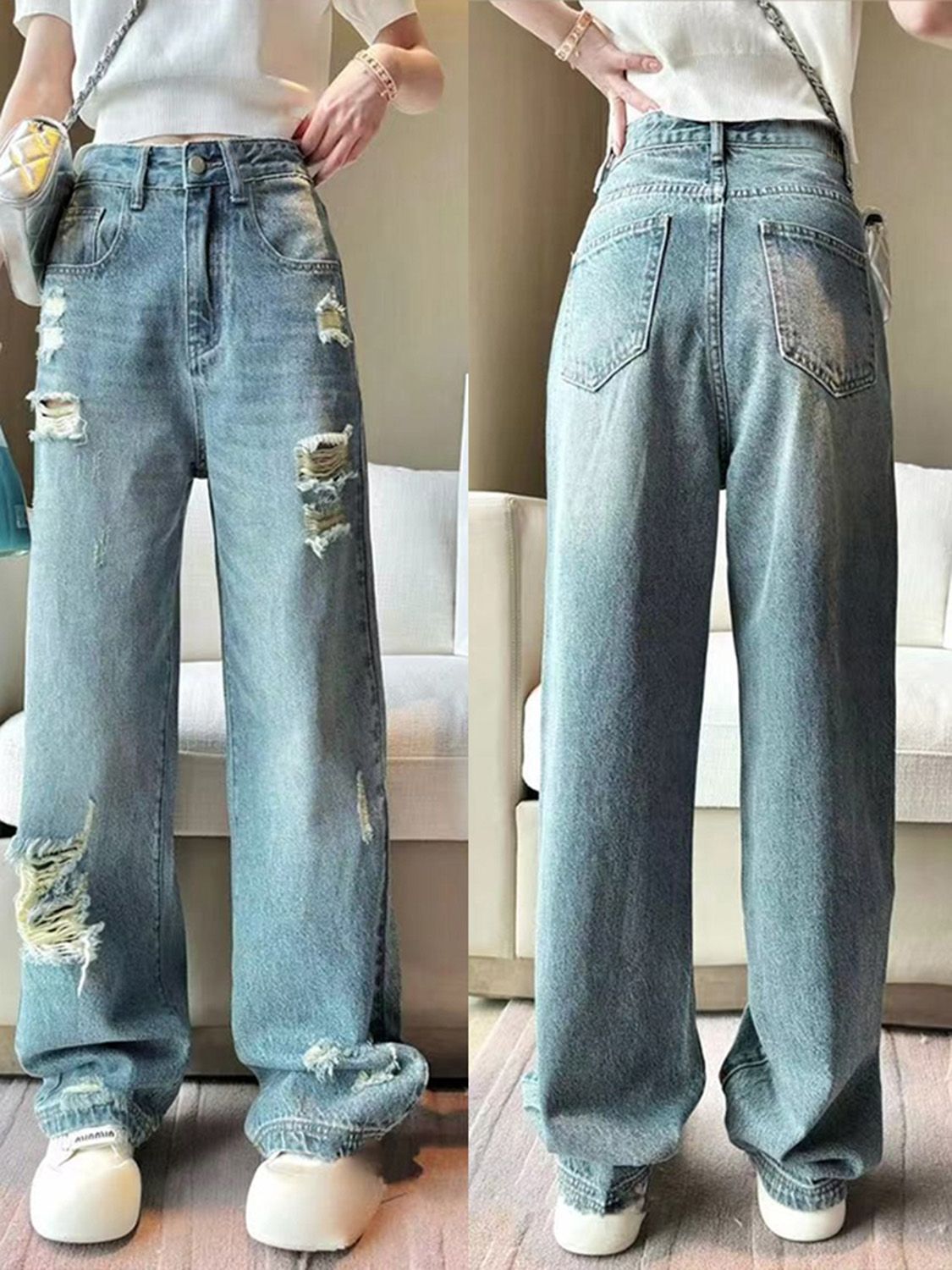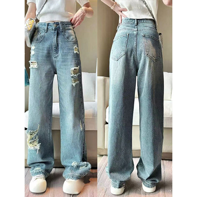 아메리칸 스타일 하이 스트리트 라이트 블루 래핑 스트레이트 청바지 여성용 여름 얇은 작은 하이 웨이스트 와이드 레그 바지스토어 가기