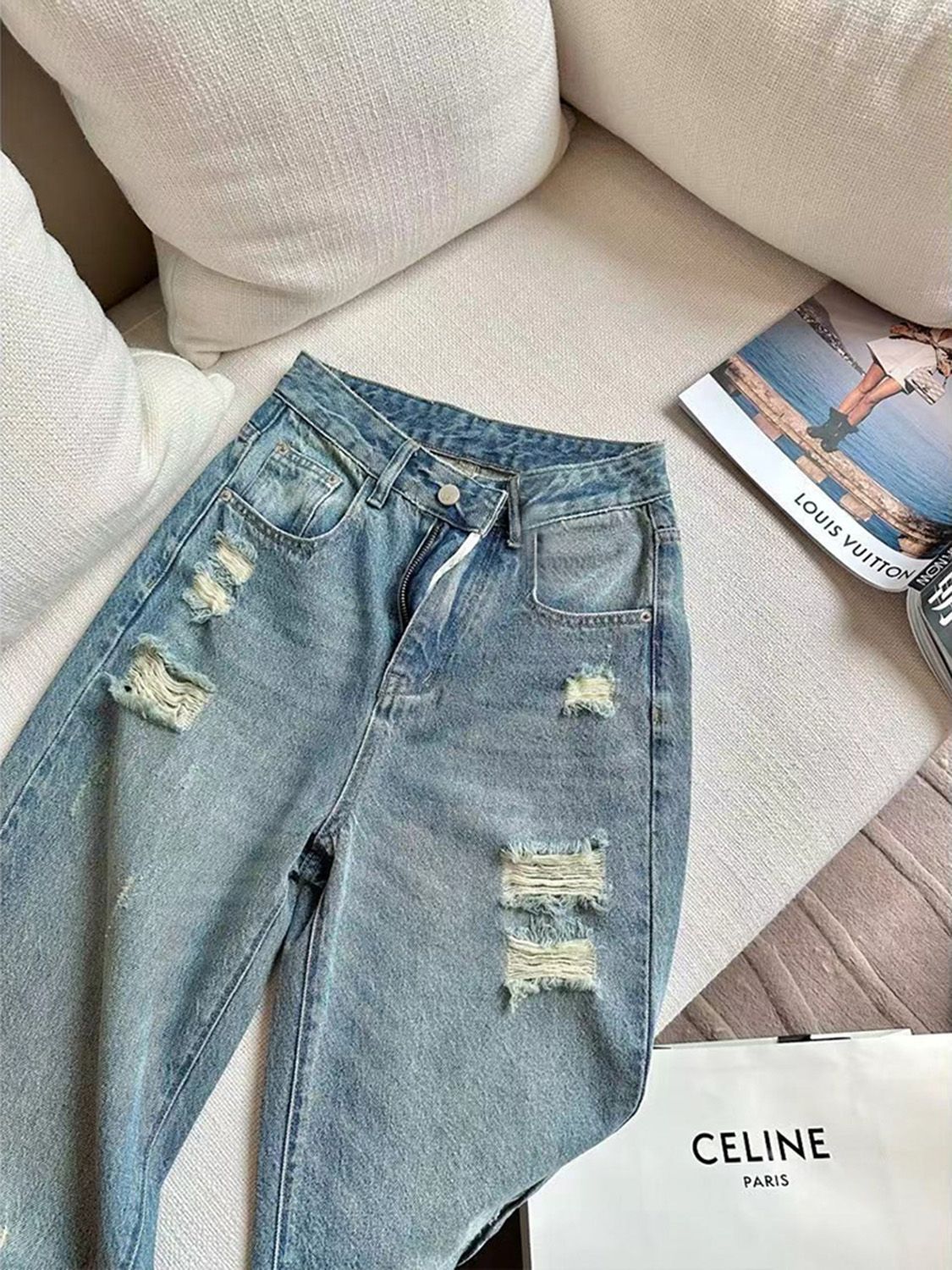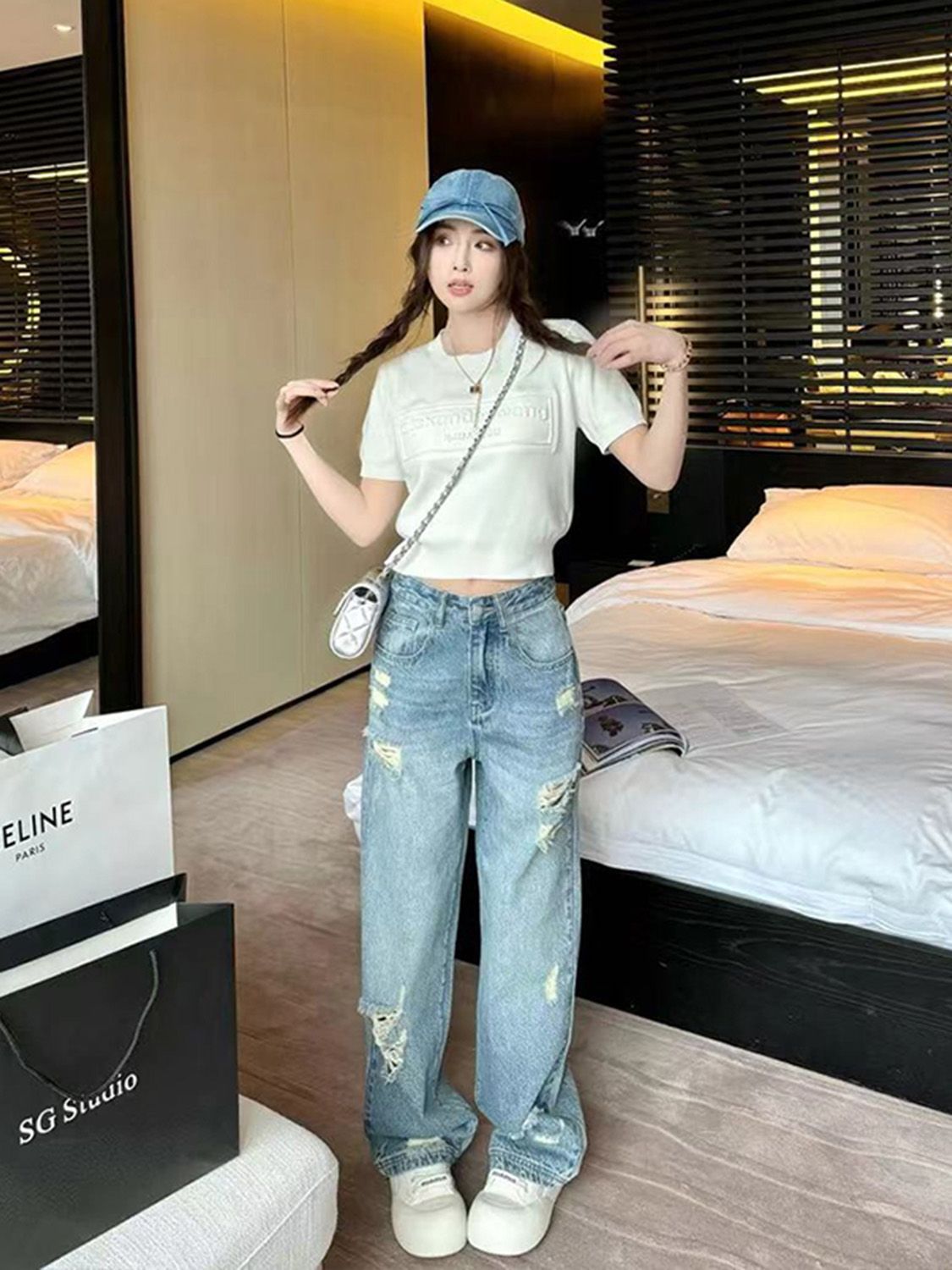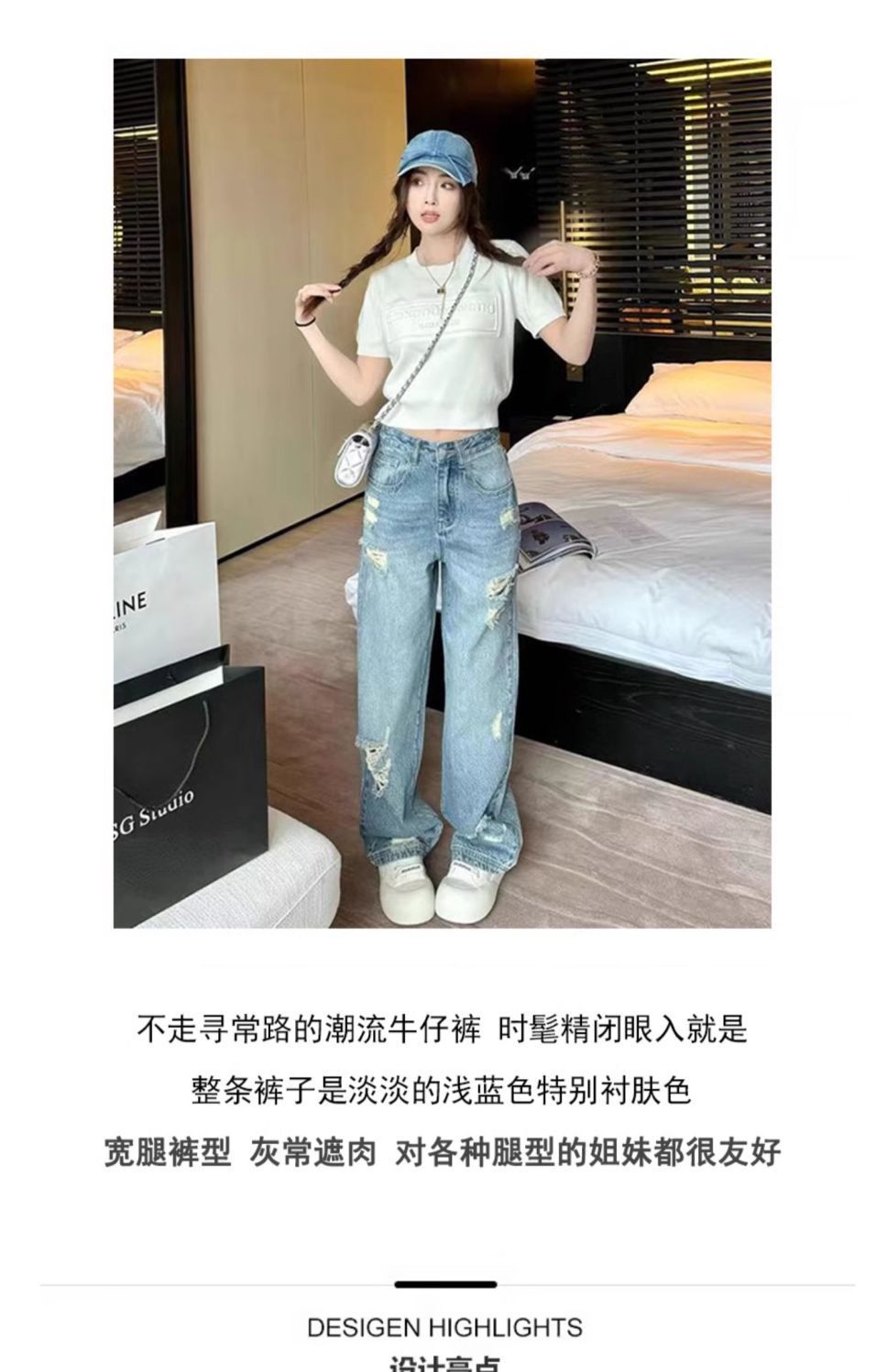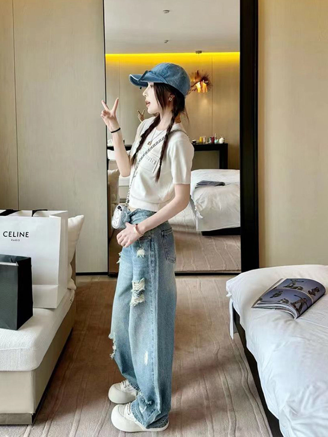 아메리칸 스타일 하이 스트리트 라이트 블루 래핑 스트레이트 청바지 여성용 여름 얇은 작은 하이 웨이스트 와이드 레그 바지스토어 가기