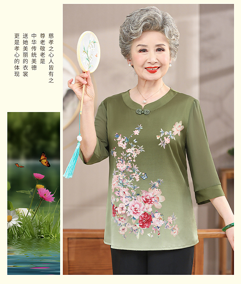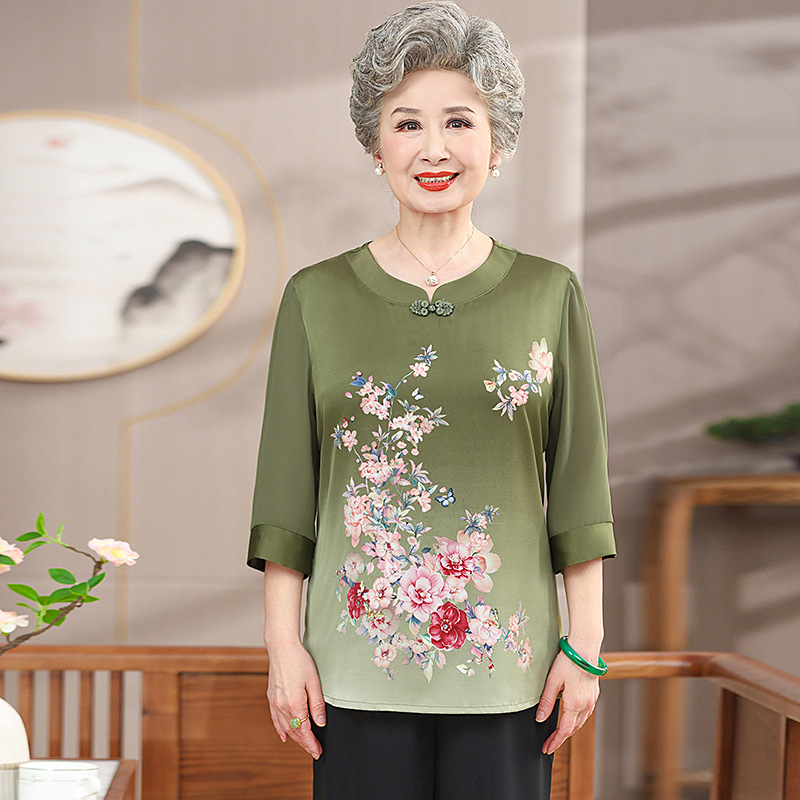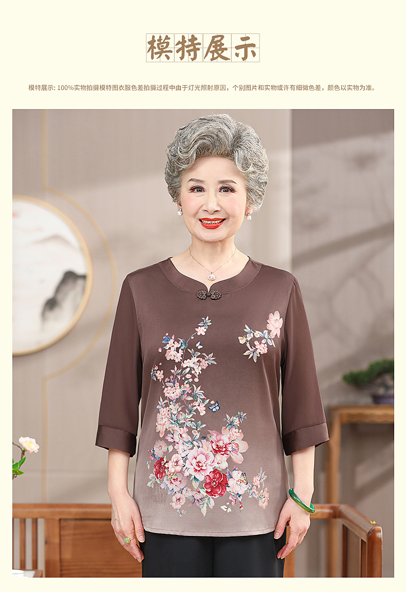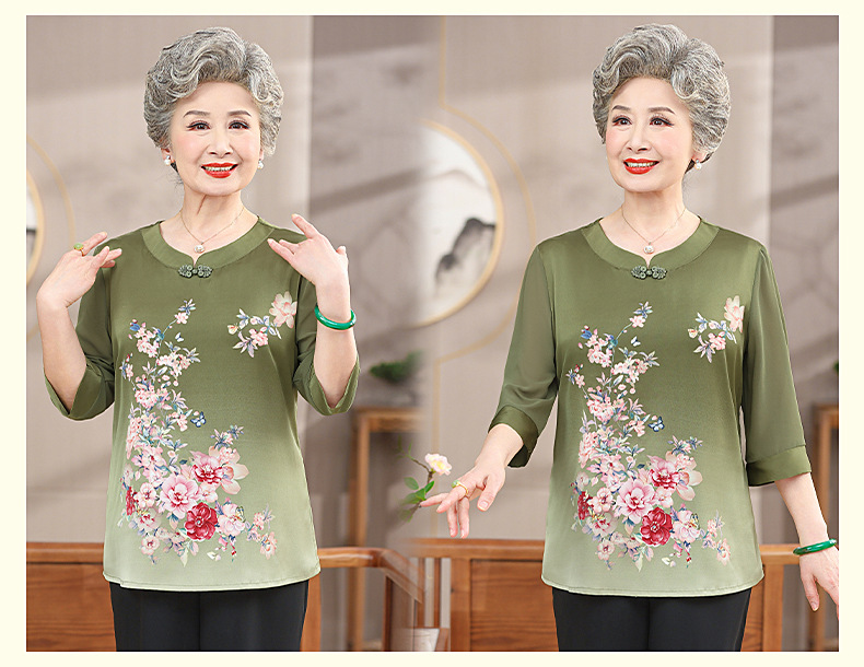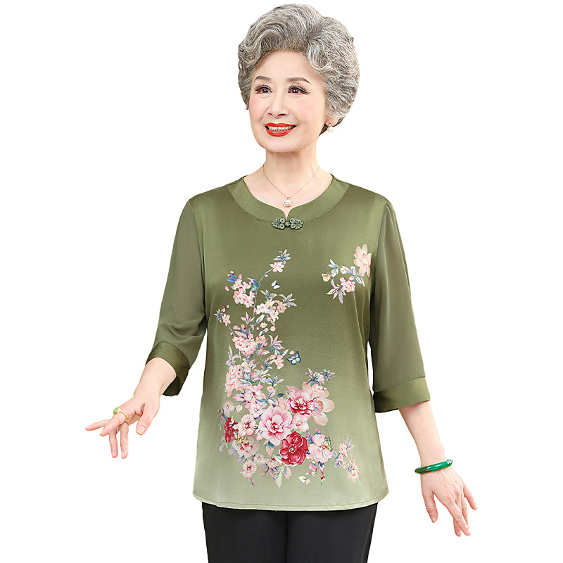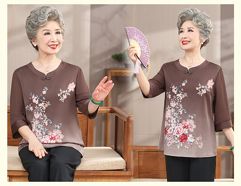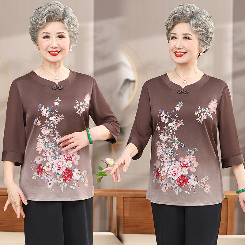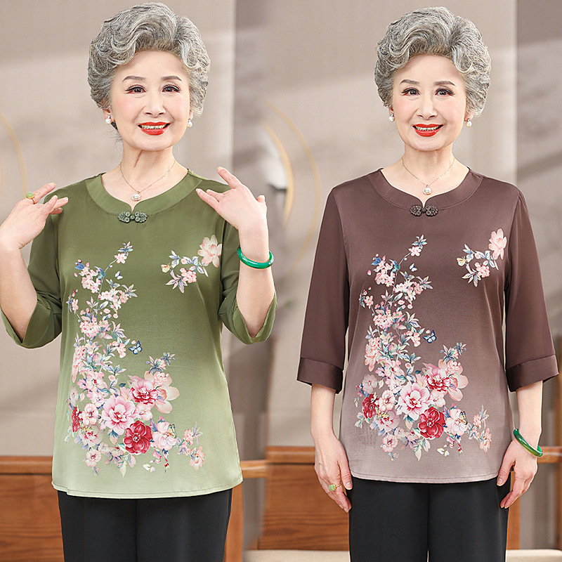 할머니 여름 반팔 여성 중년 및 노인 시폰 티셔츠 엄마 2024 새로운 라운드 넥 작은 노인 서양 스타일