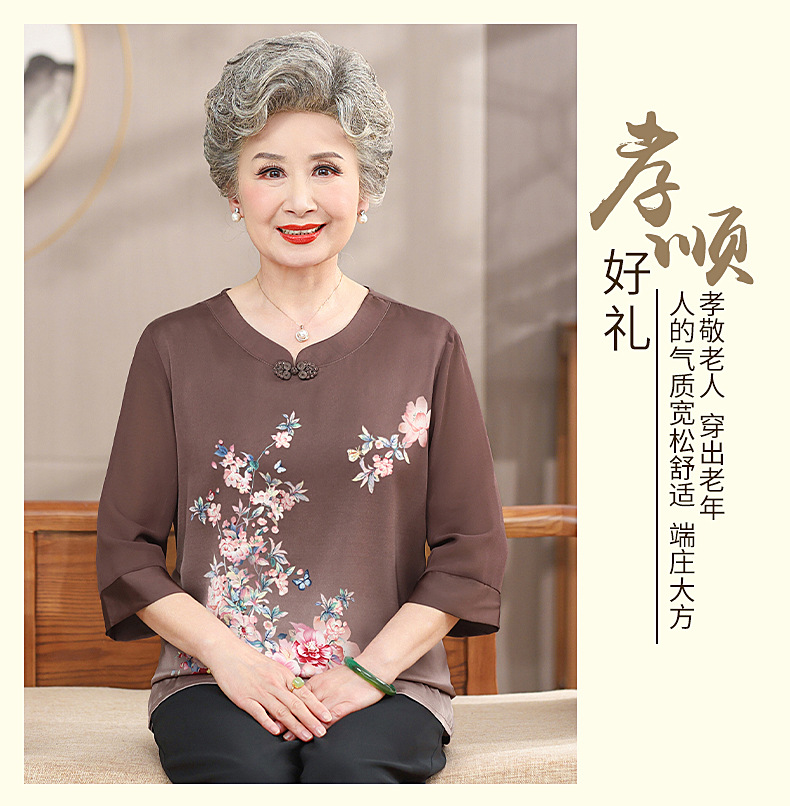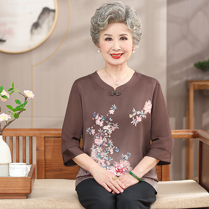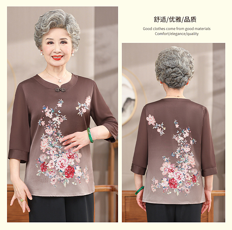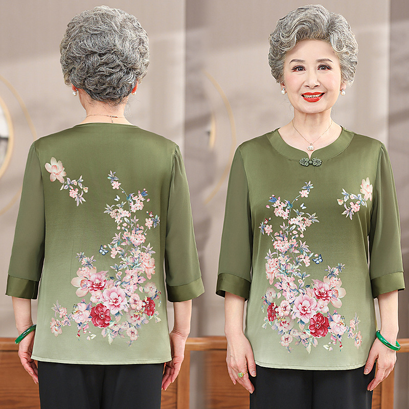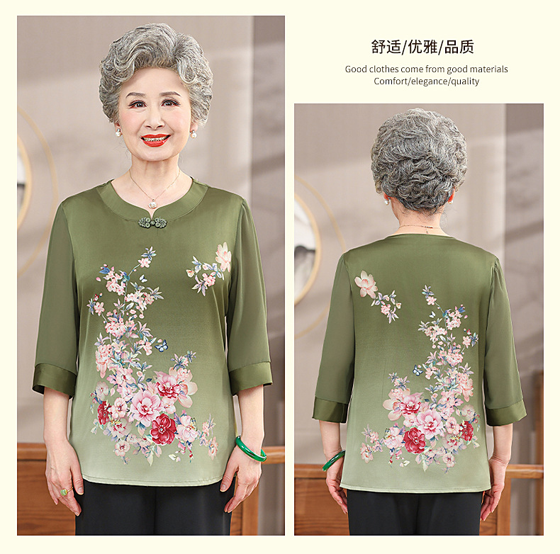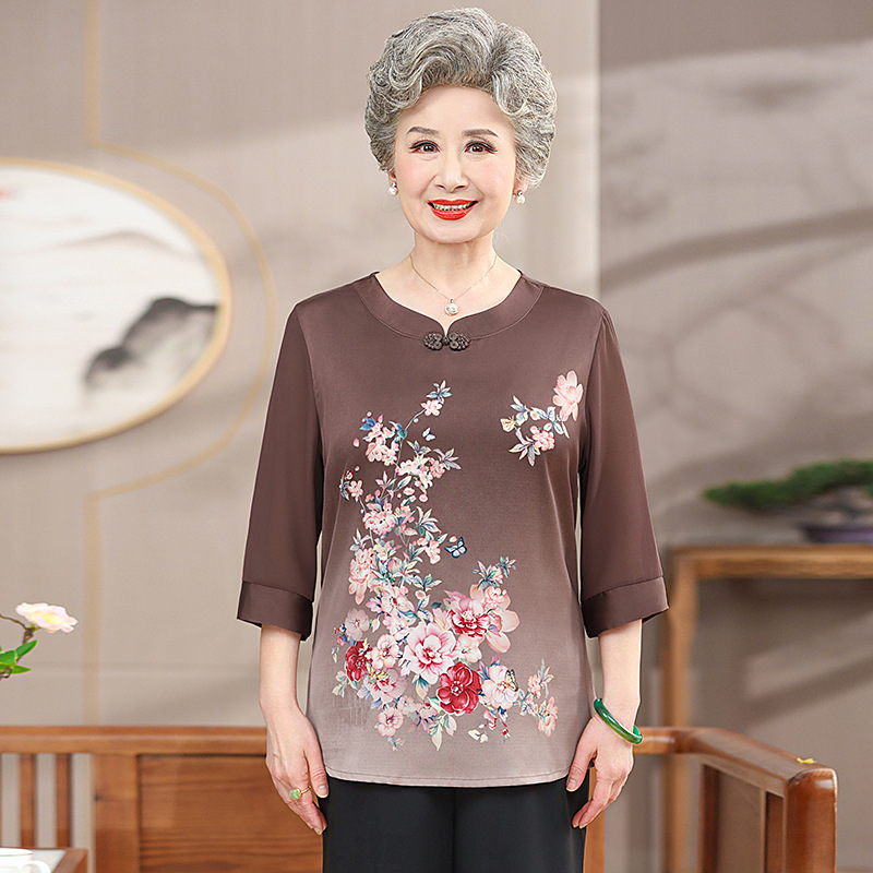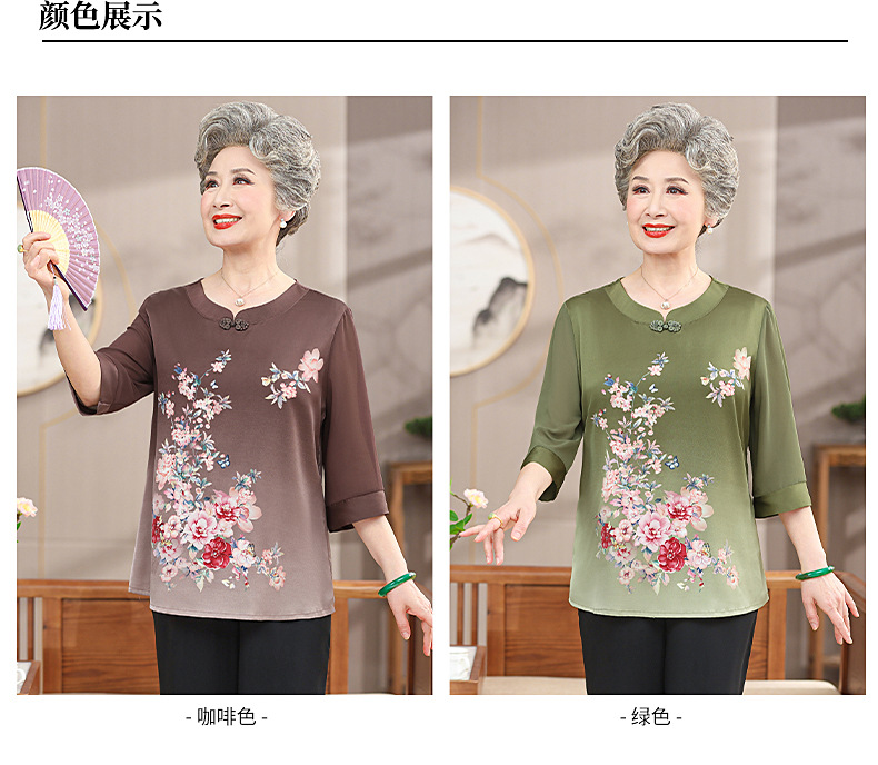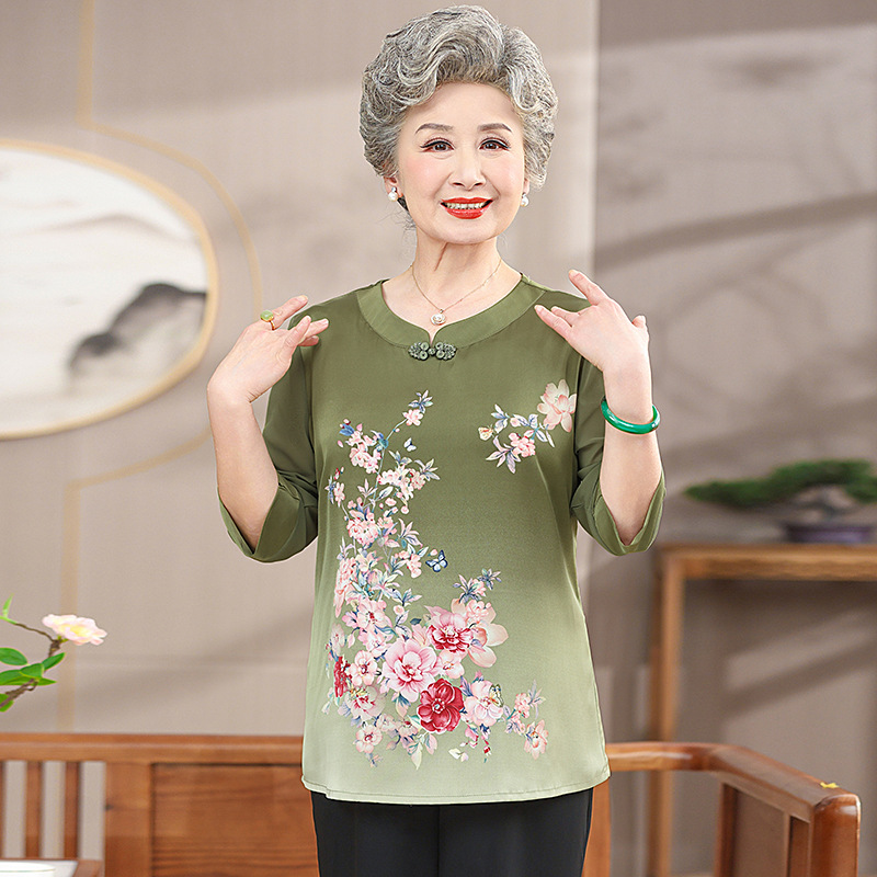 할머니 여름 반팔 여성 중년 및 노인 시폰 티셔츠 엄마 2024 새로운 라운드 넥 작은 노인 서양 스타일