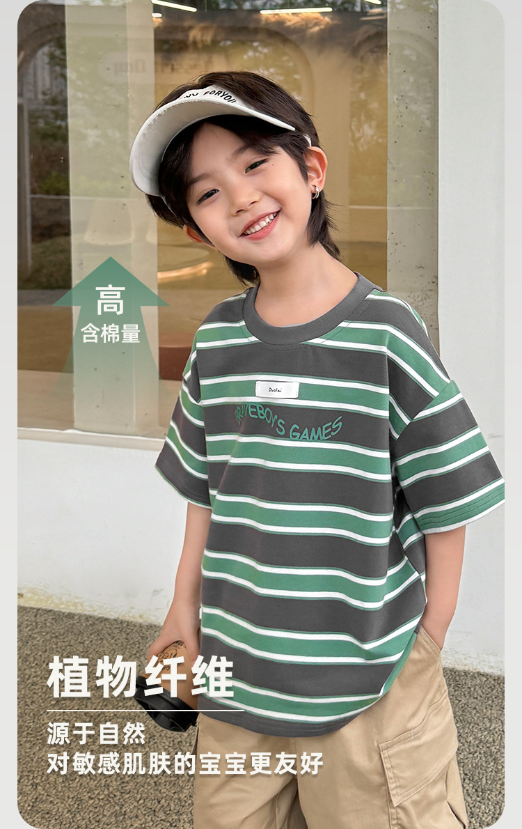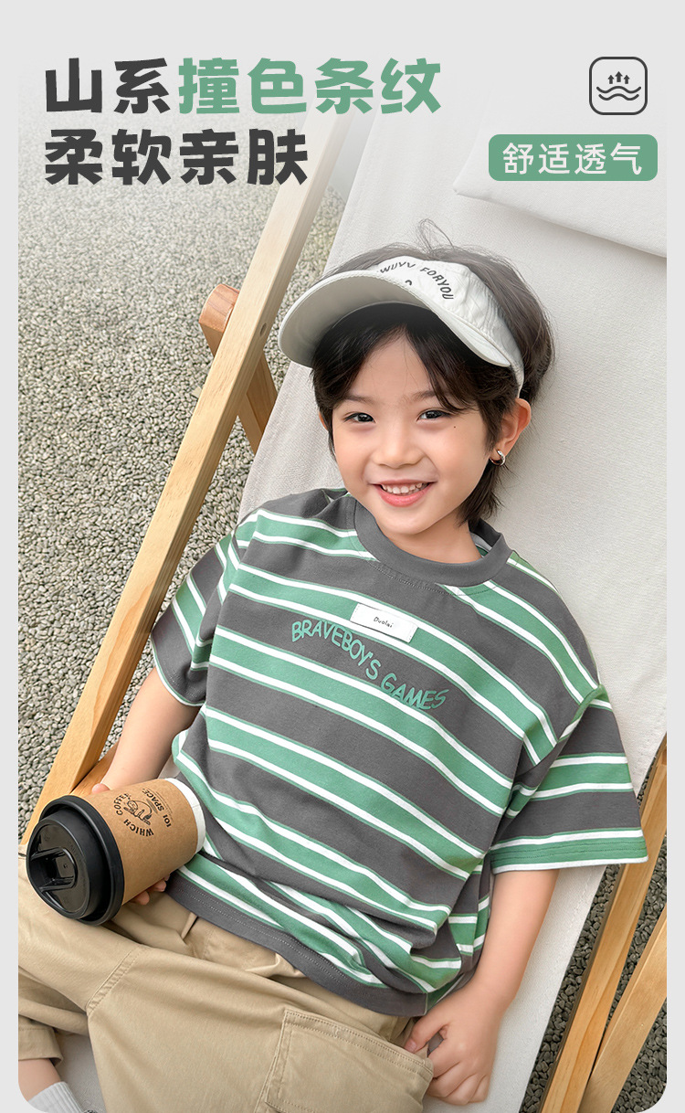 Haima의 2025 년 여름 새 소년 코튼 스트라이프 반팔 티셔츠 한국식 여름 옷