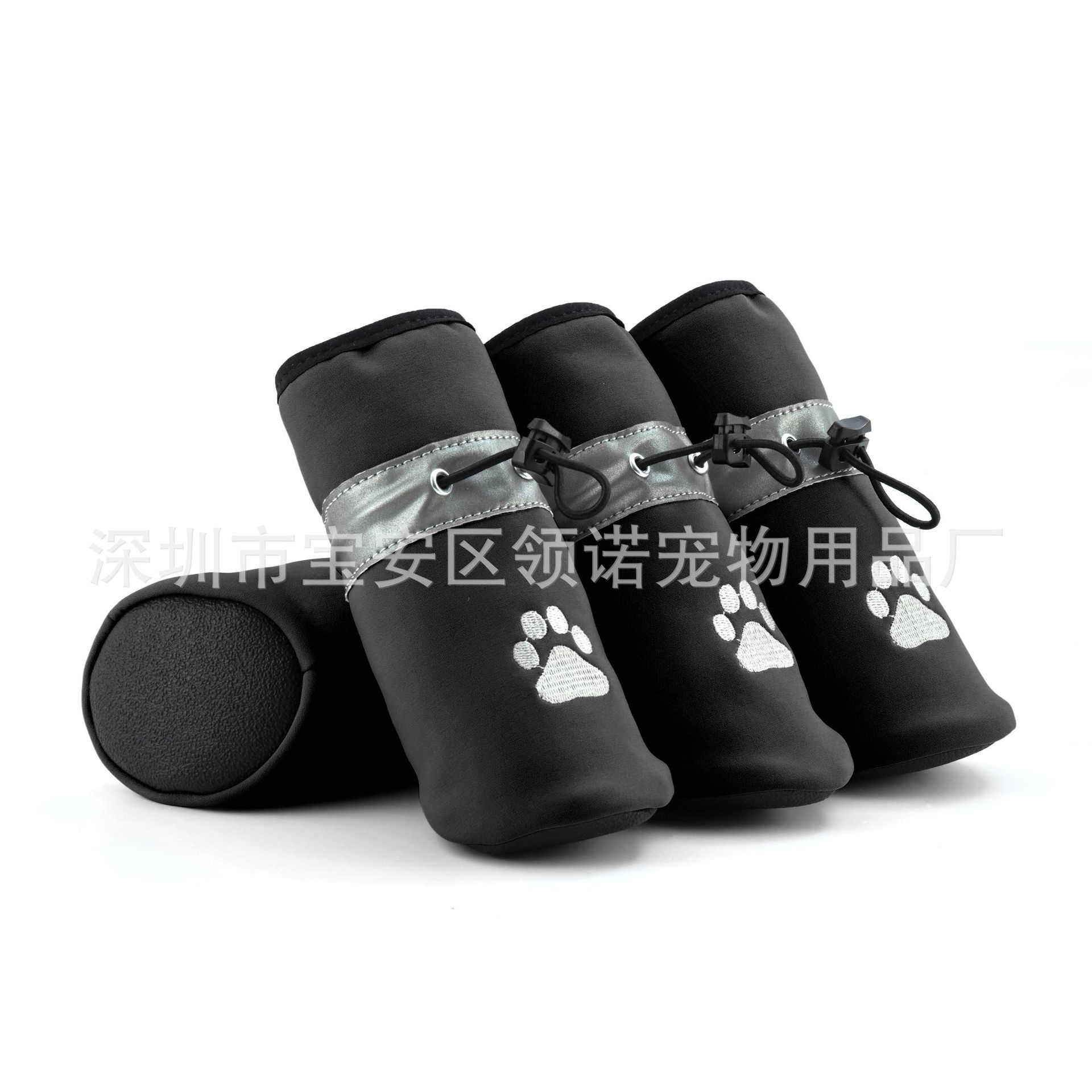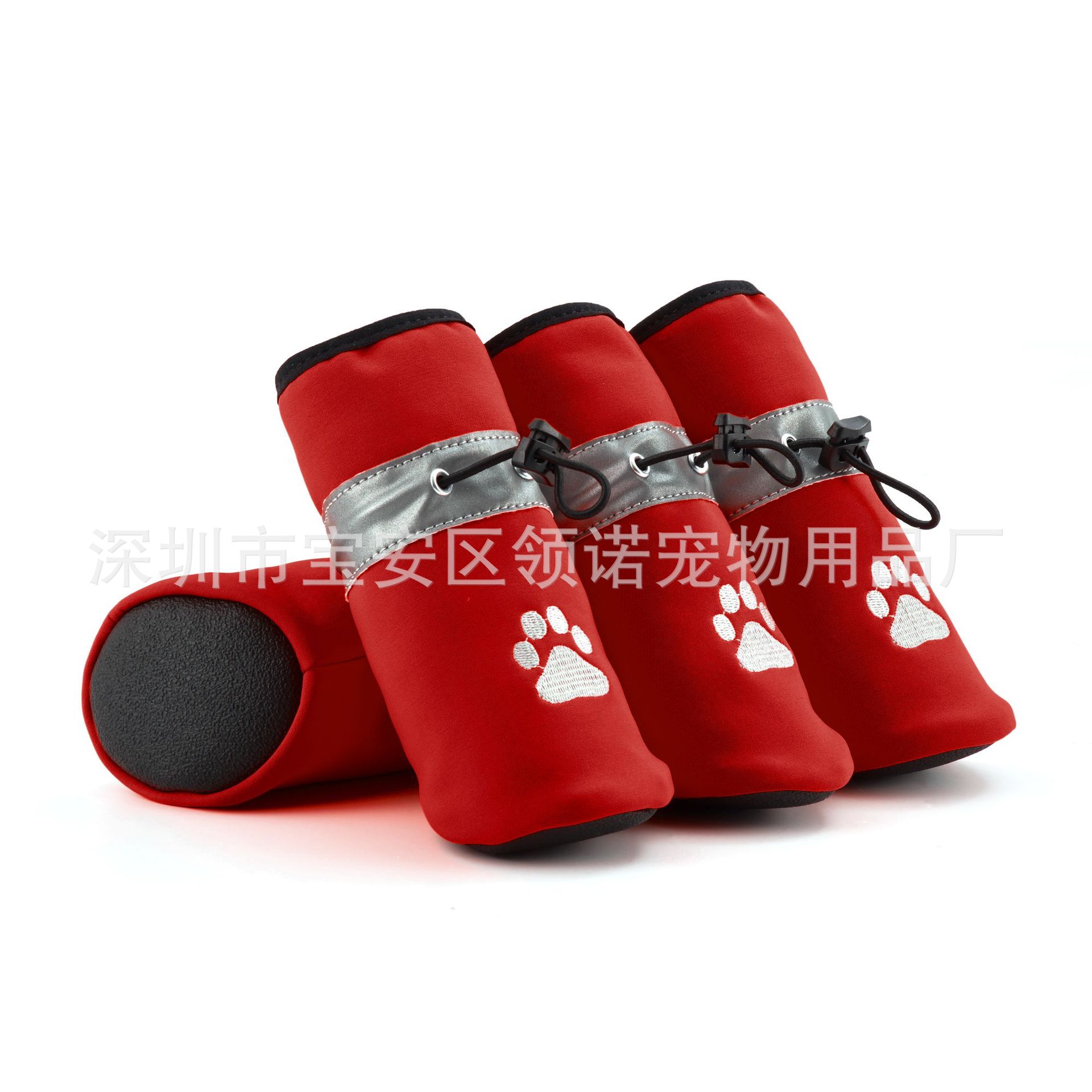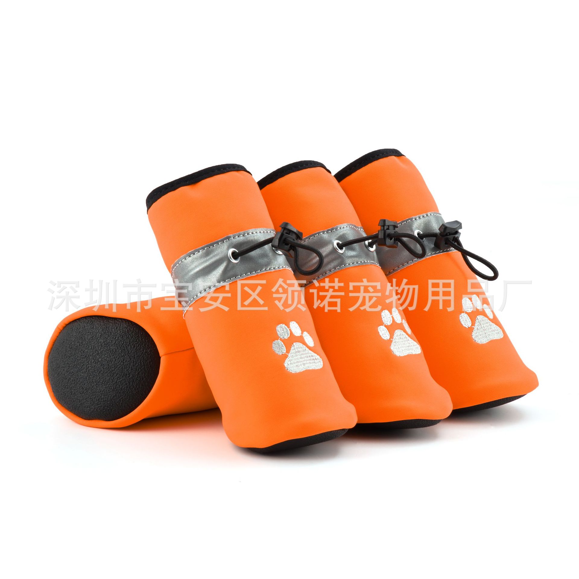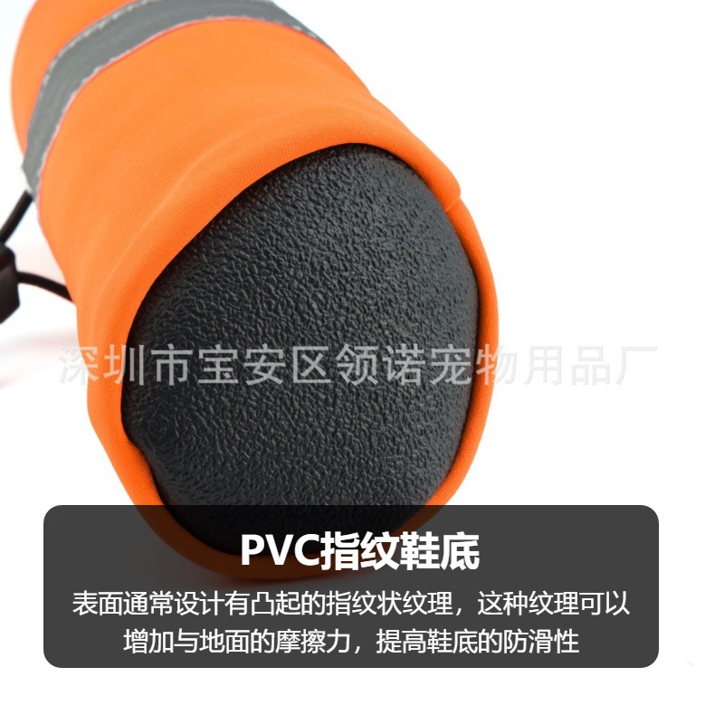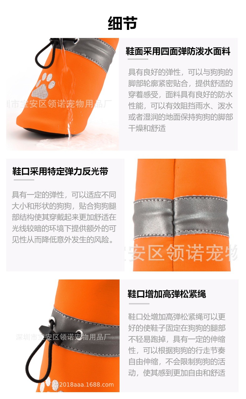 【本品特点】:鞋子采用彩色四面弹防泼水面料,不仅能保持宠物爪子干燥,还能抵御雨水和泼水的侵袭,确保您的宠物在户外活动时始终保持。配备特定弹力反光带,提高了狗狗在夜间或低光环境下的可见性和性结合高弹松紧绳,确保了鞋子紧密贴合狗狗的爪子,不易滑脱,让狗狗自由奔跑、尽情游玩。PVC指纹鞋底不仅增加了鞋子的抓地力和耐磨性,还提供了良好的防滑性,让您的宠物在各种地面上都能稳步行走,尽情探索世界。