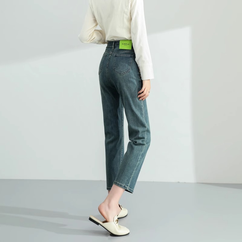 스트레치 디자인 그린 라벨 높은 허리 작은 직선 청바지 여성 한국 스타일의 우아한 배 모양의 슬림 핏 자른 빈티지 연기 튜브 바지스토어 가기
