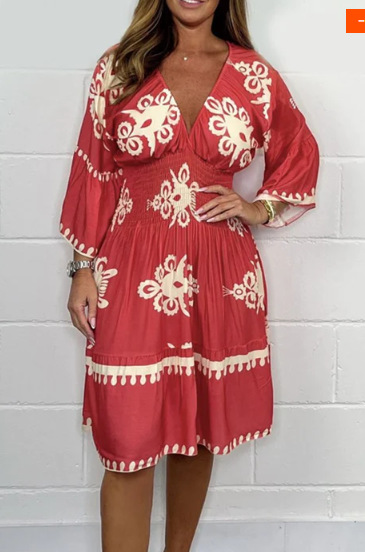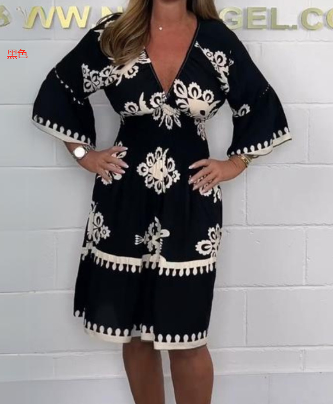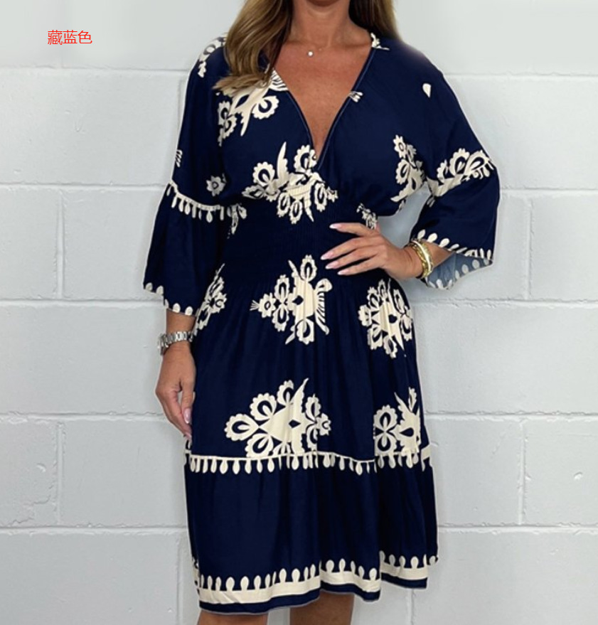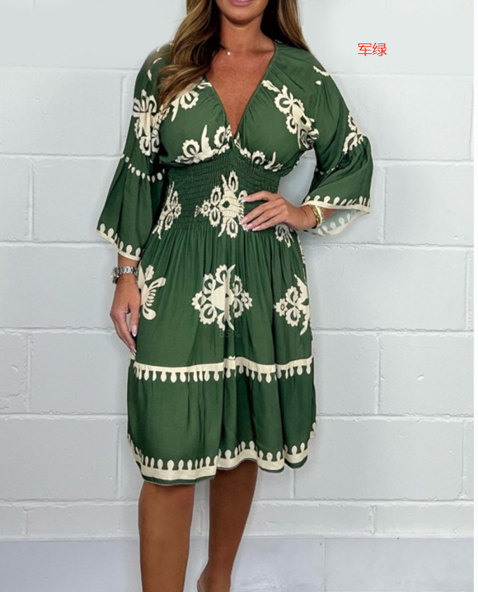 아마존 폭발 2024 여름 새로운 유럽과 미국의 패션 대외 무역 여성의 V-목 인쇄 원피스