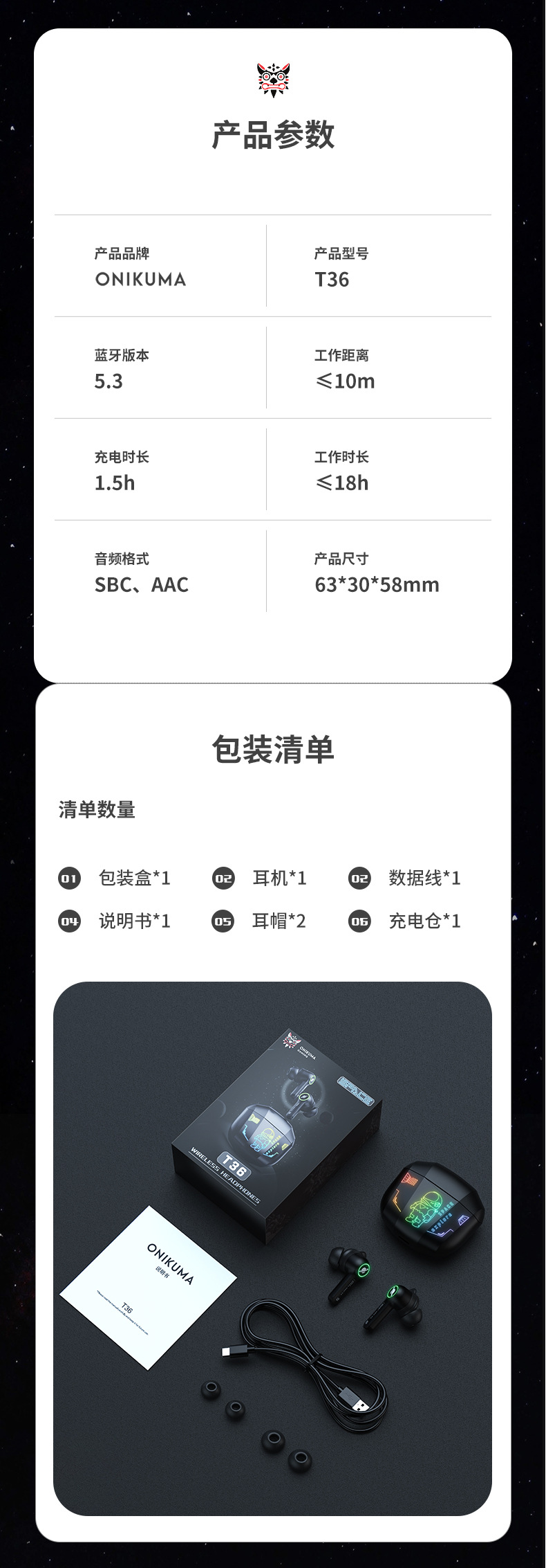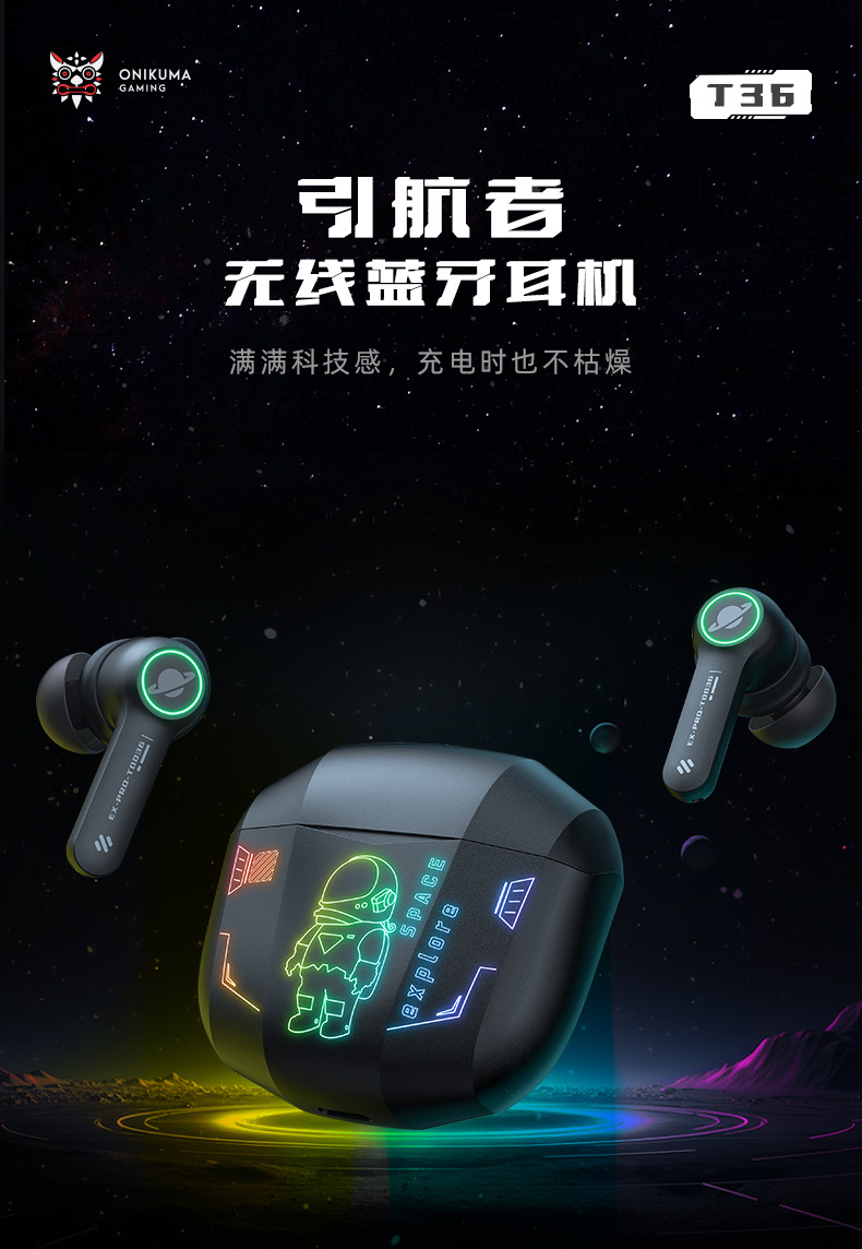 ONIKUMA T36 공장 직접 TWS 무선 블루투스 음악 먹는 닭 낮은 지연 소음 감소 게임 헤드셋
