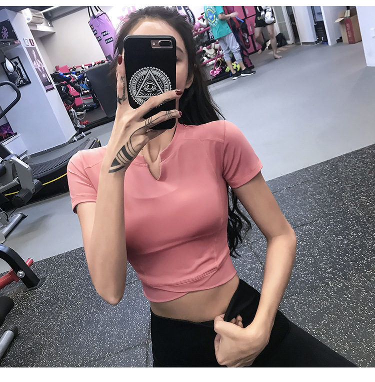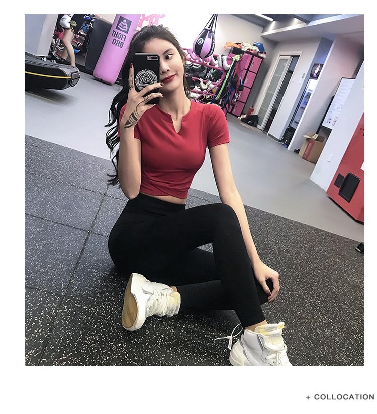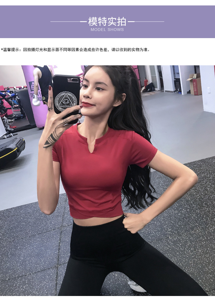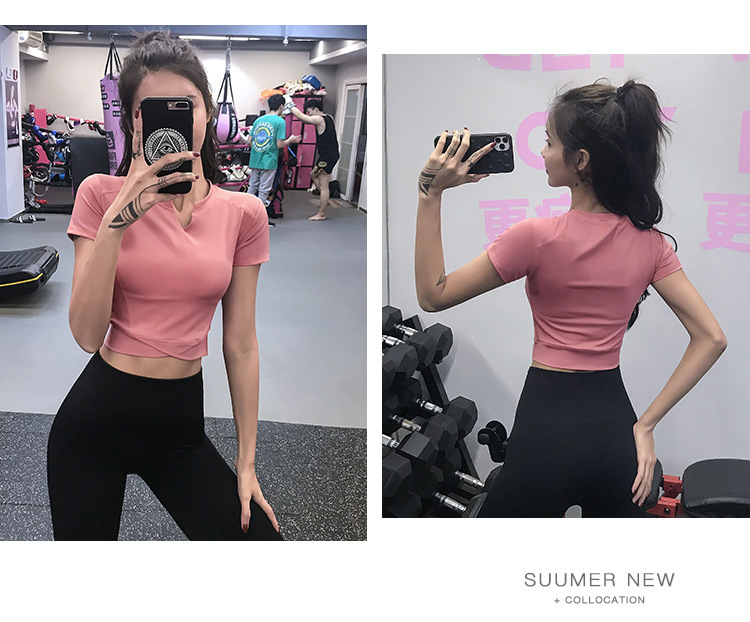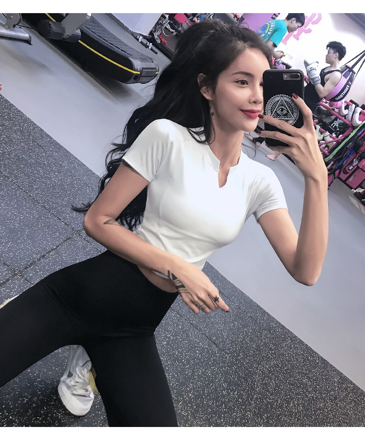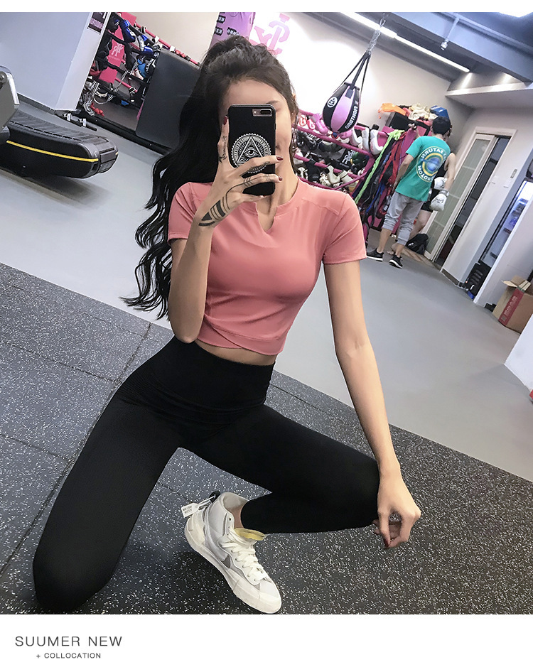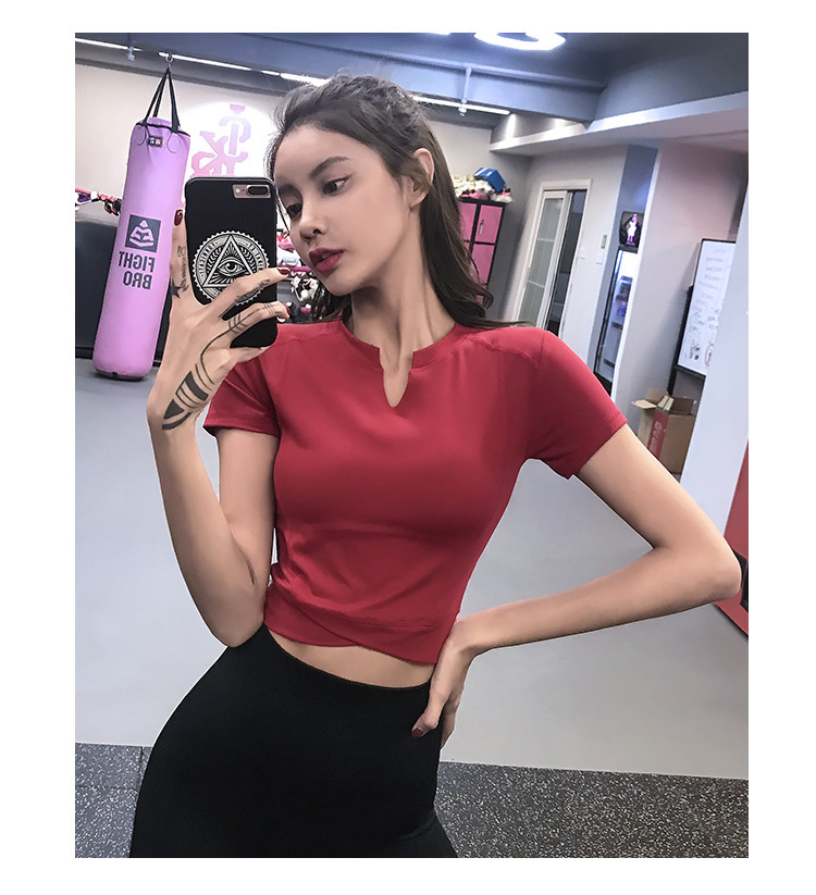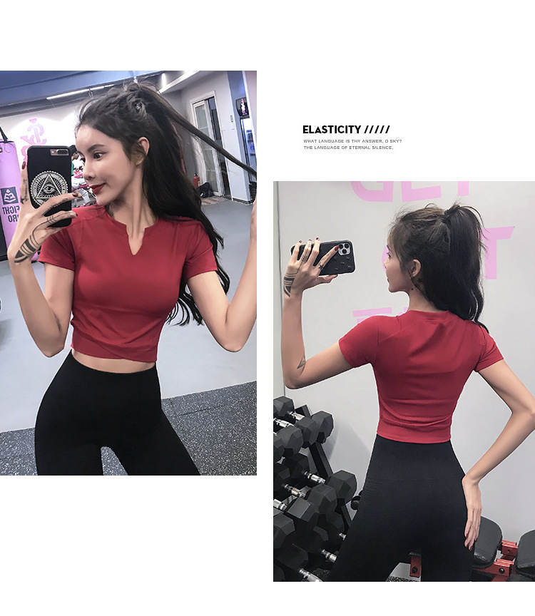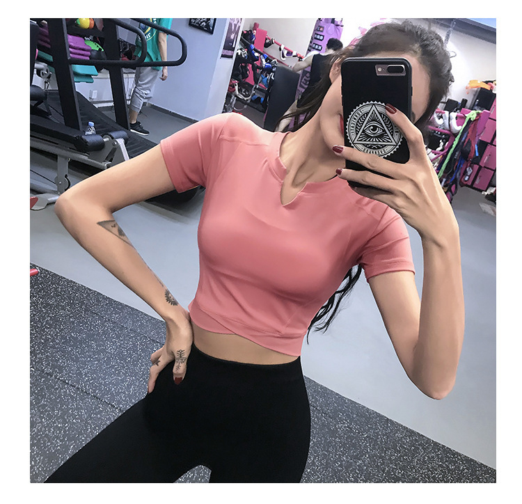 스트레치 슬림 핏 V 넥 요가 세트 여성 주름 빠른 건조 반팔 티셔츠 필라테스 훈련 피트니스 스포츠 달리기 고급스토어 가기