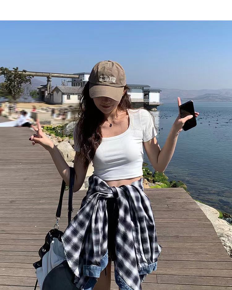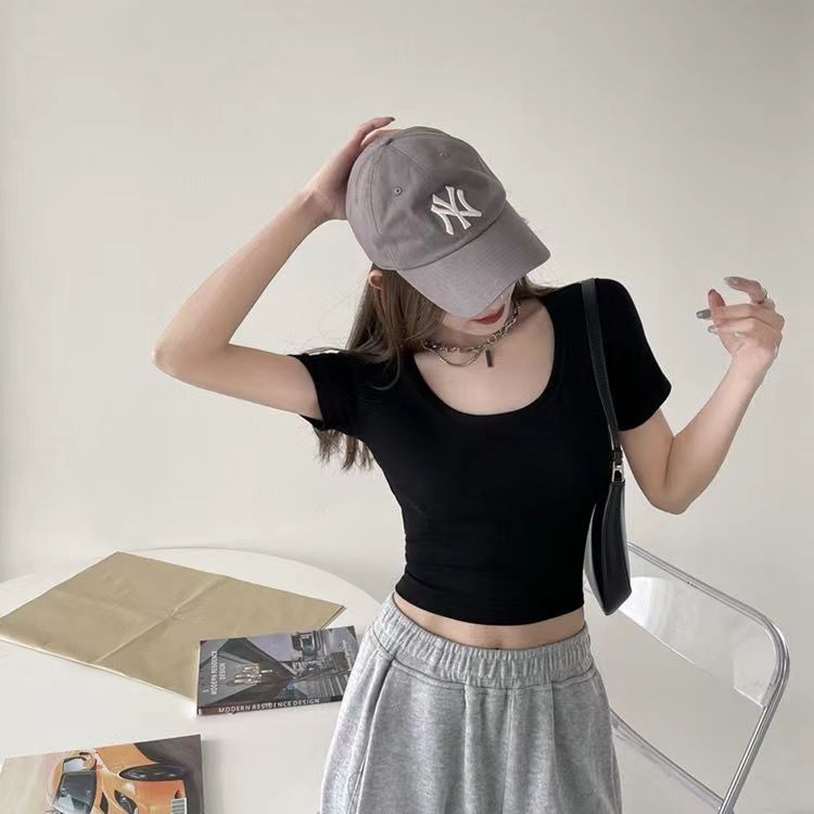 여름 새로운 순수한 욕망 U-넥 티셔츠 여성용 반팔 여름 슬림 핏 슬리밍 핫 걸스 배꼽 짧은 Bottoming Top Ins스토어 가기