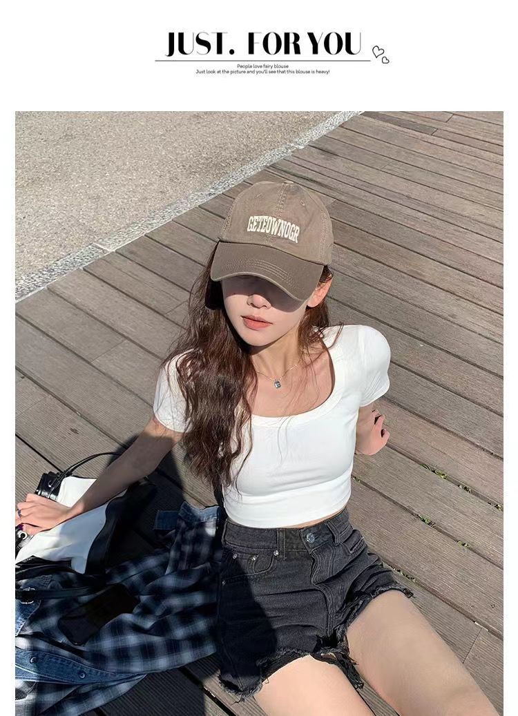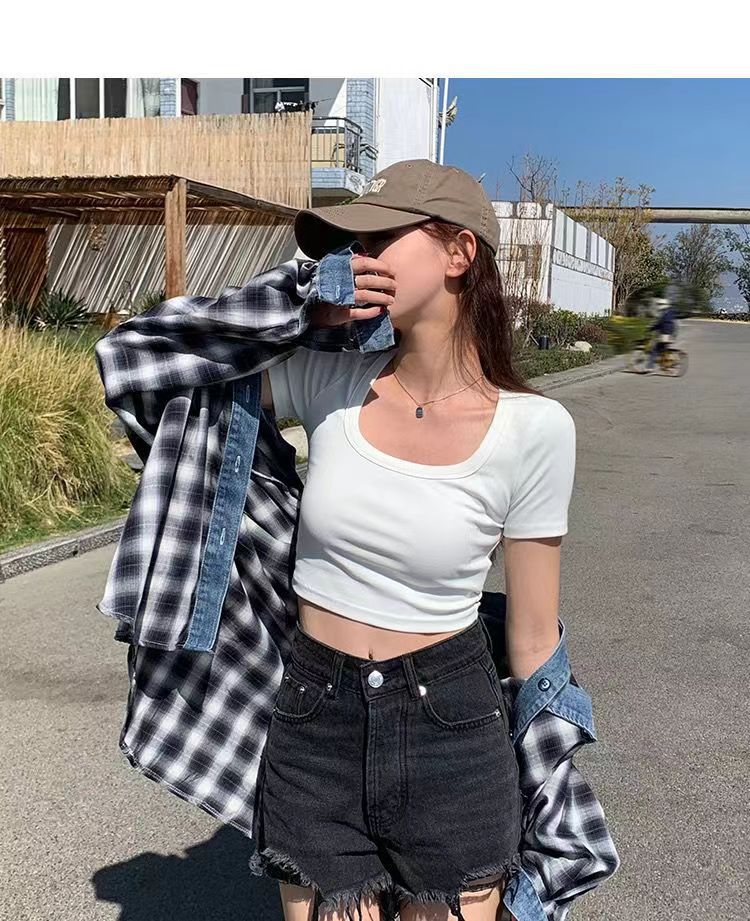 여름 새로운 순수한 욕망 U-넥 티셔츠 여성용 반팔 여름 슬림 핏 슬리밍 핫 걸스 배꼽 짧은 Bottoming Top Ins