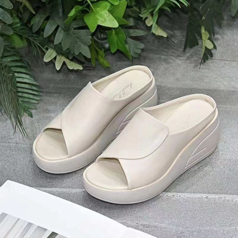 여성용 2024 년 여름 용 두꺼운 밑창 부드러운 가죽 샌들 부드러운 바닥 높이가 증가하는 생선 입 머핀 하이힐 슬리퍼 최신 부드러운 가죽 하이힐 신발스토어 가기