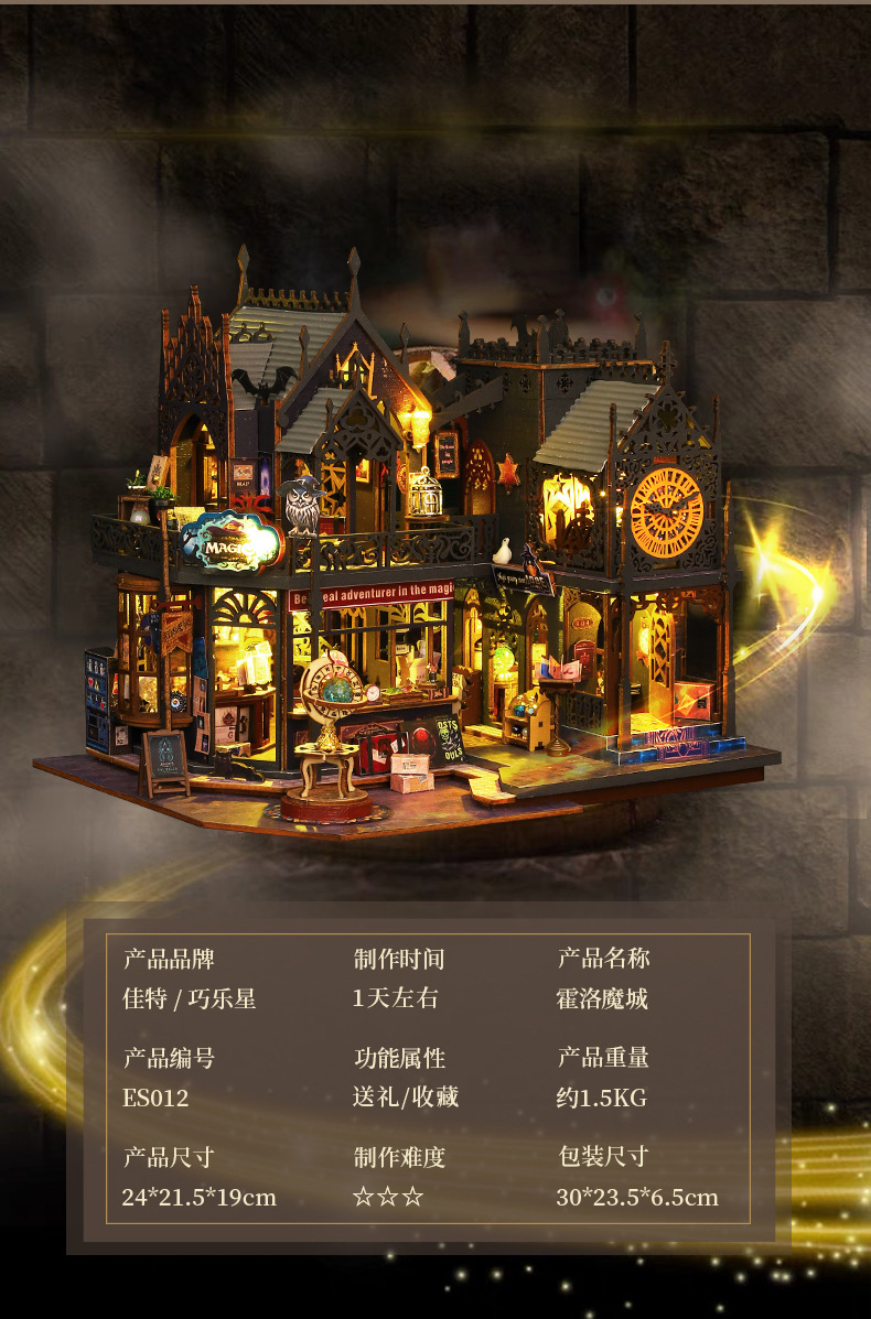 商品基本信息:ES012-B霍洛魔城(带防尘罩) 单个重量1.3KG  一箱16个   产品盒装尺寸:30*6.5*23.5CM 成品尺寸:24*19*22CM
