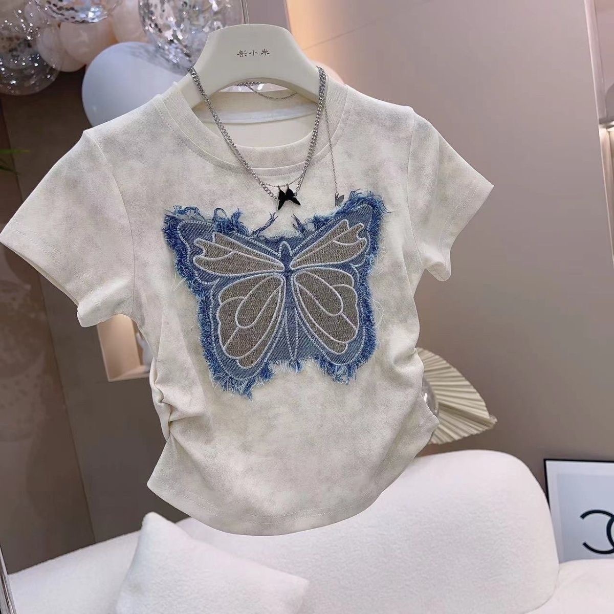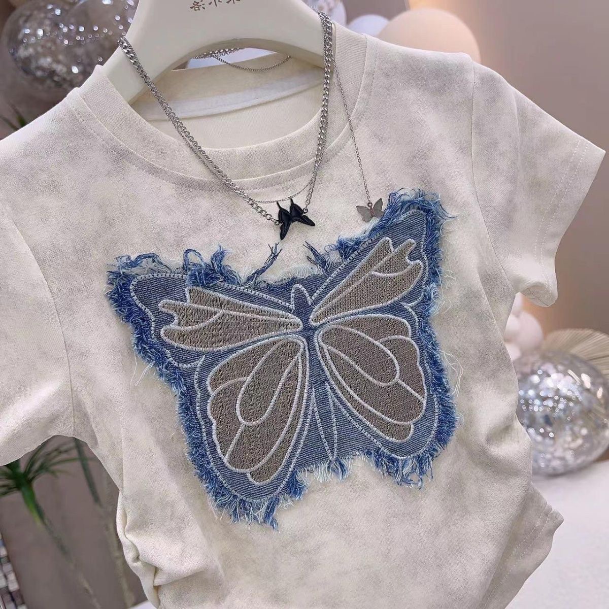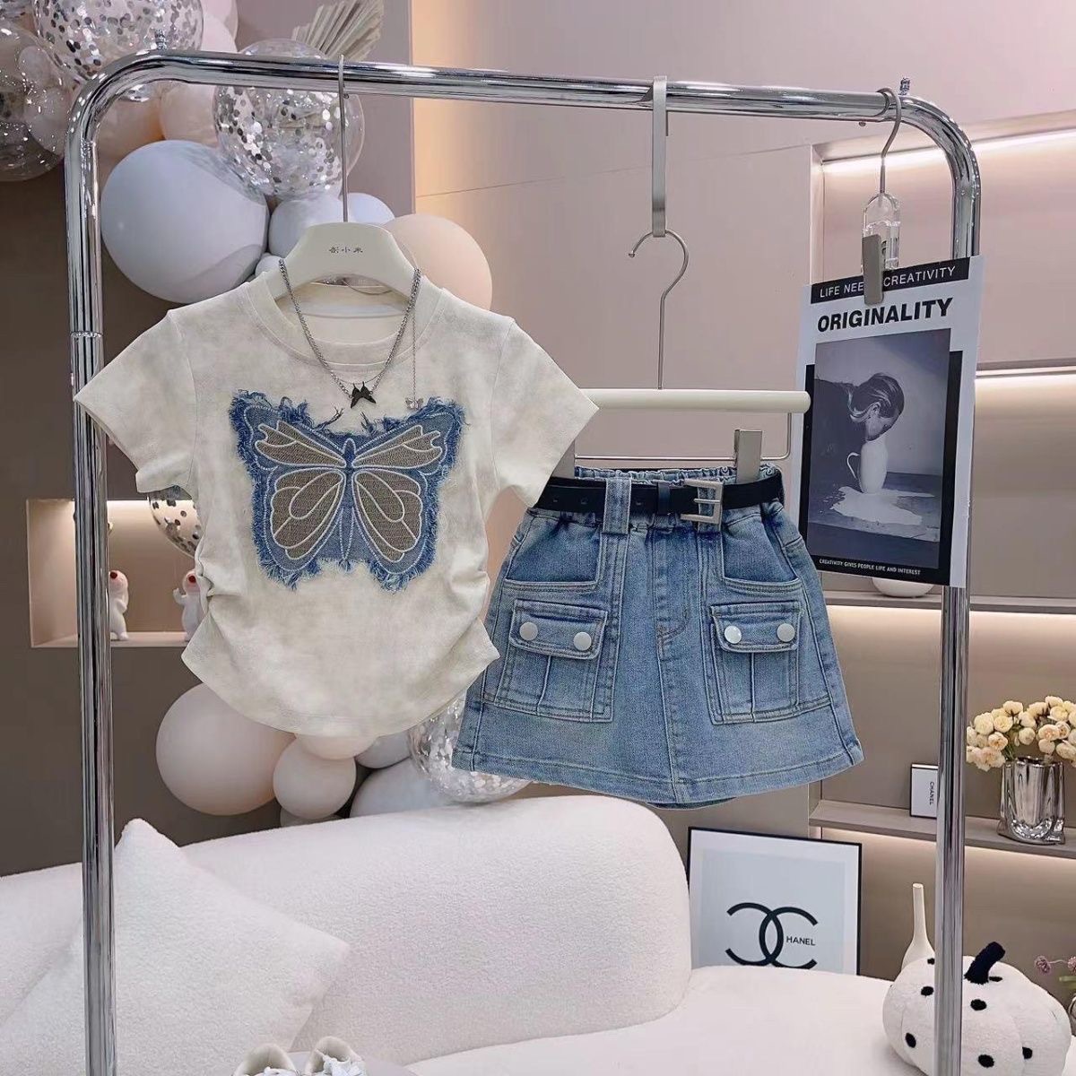 여아 2025 여름 의류 세트, 여름 신상 아동 스타일 반팔 티셔츠, 캐주얼 인터넷 연예인 데님 스커트 투피스 세트