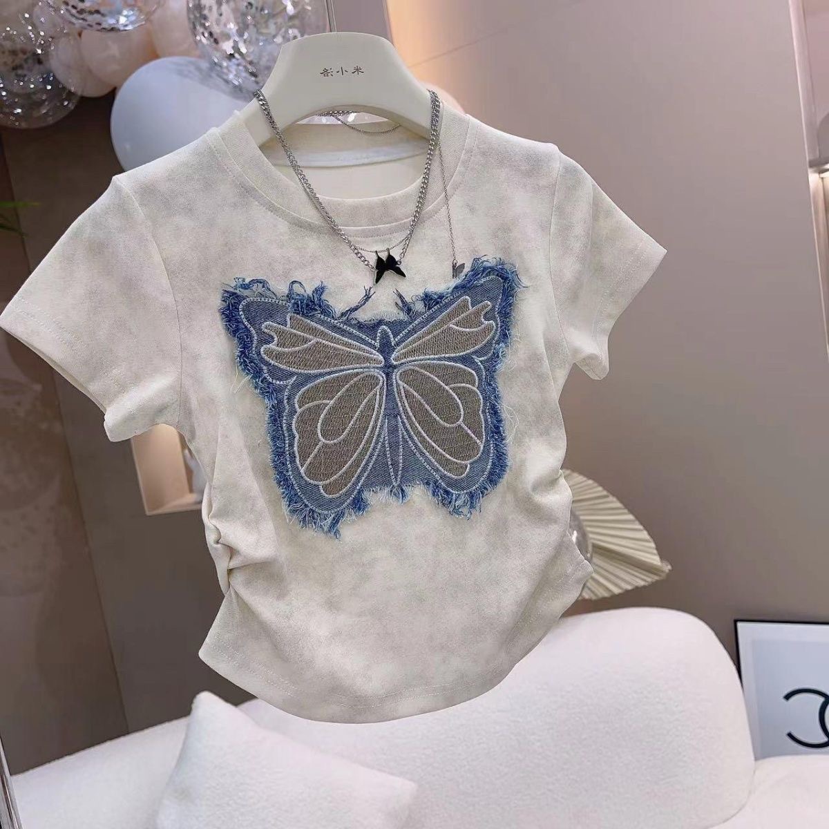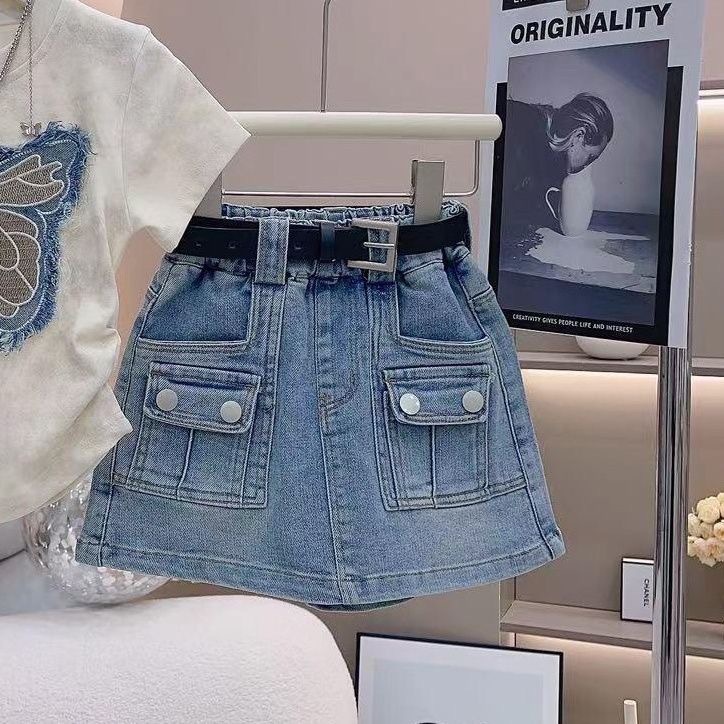 여아 2025 여름 의류 세트, 여름 신상 아동 스타일 반팔 티셔츠, 캐주얼 인터넷 연예인 데님 스커트 투피스 세트스토어 가기