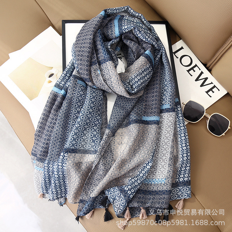 봄과 여름 새로운 기하학적 격자 무늬 명암 컬러 인쇄 된 면화 스카프 긴 인쇄 된 술 여행 외부 목도리 여성
