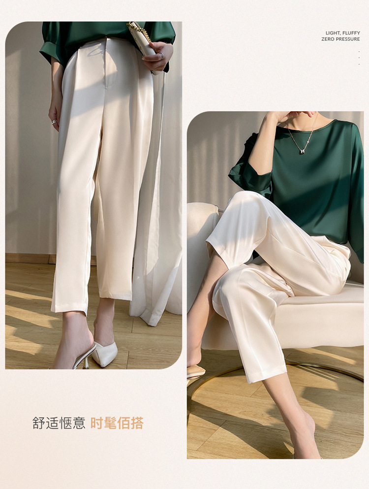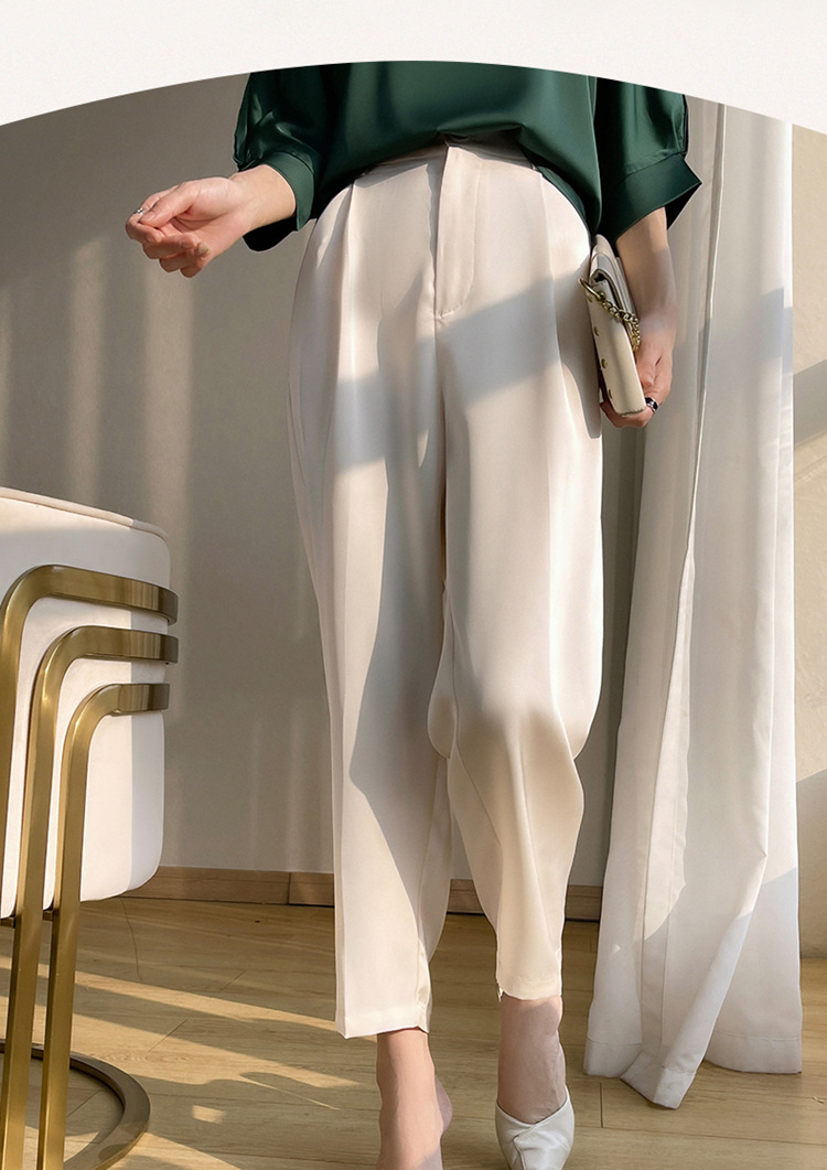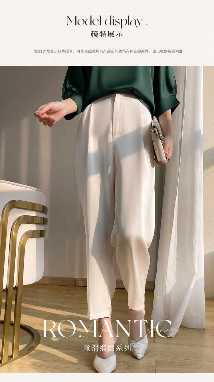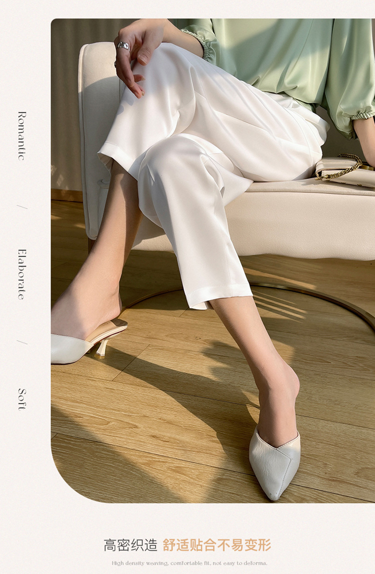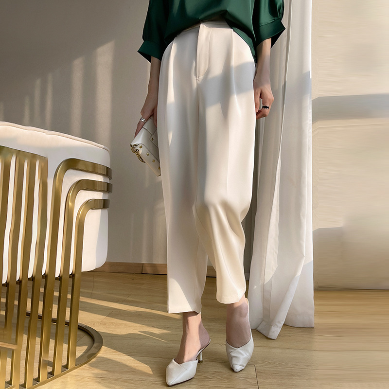 여름 얇은 Acetic Acid Silk 여성용 작은 반 탄성 미드 웨이스트 화이트 자른 세트 바지