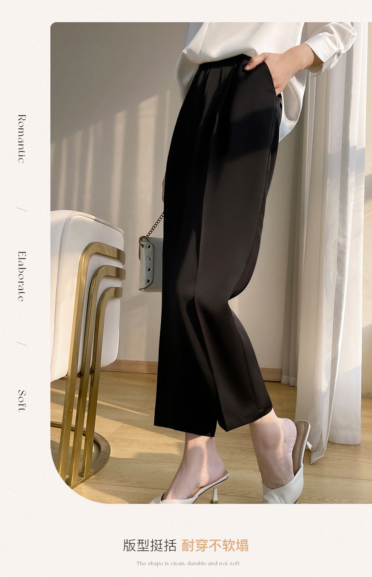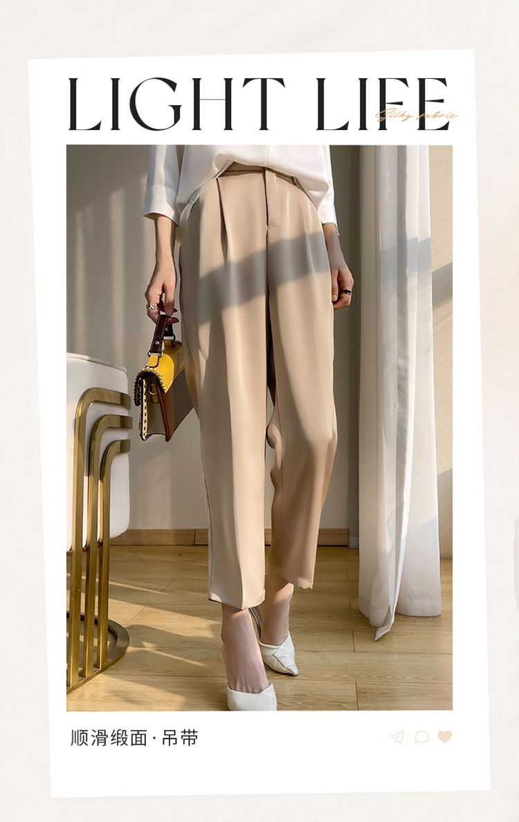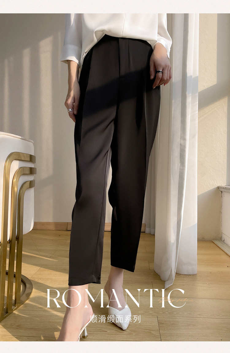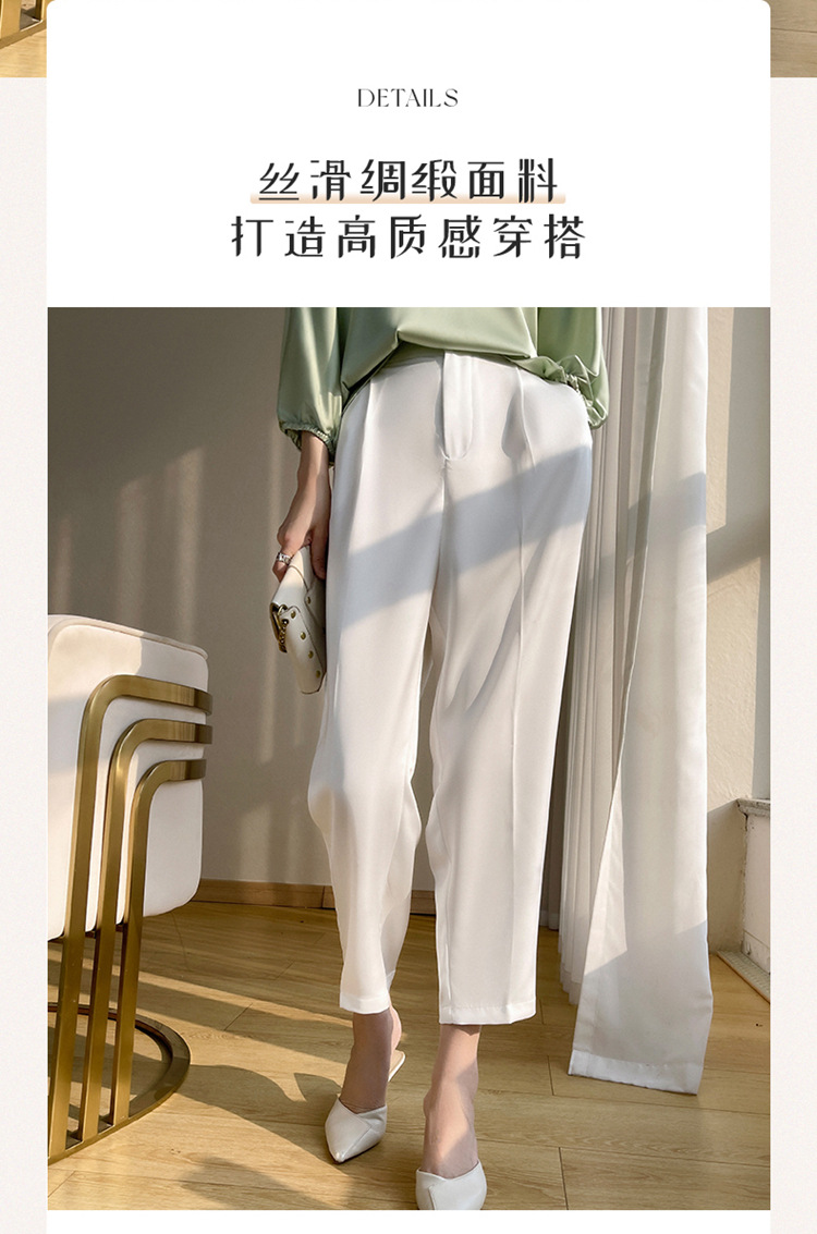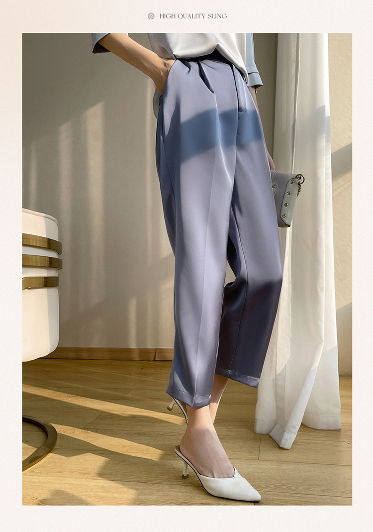 여름 얇은 Acetic Acid Silk 여성용 작은 반 탄성 미드 웨이스트 화이트 자른 세트 바지
