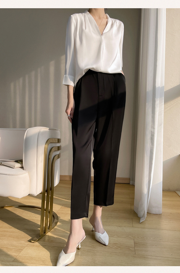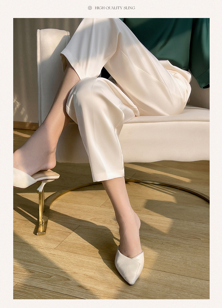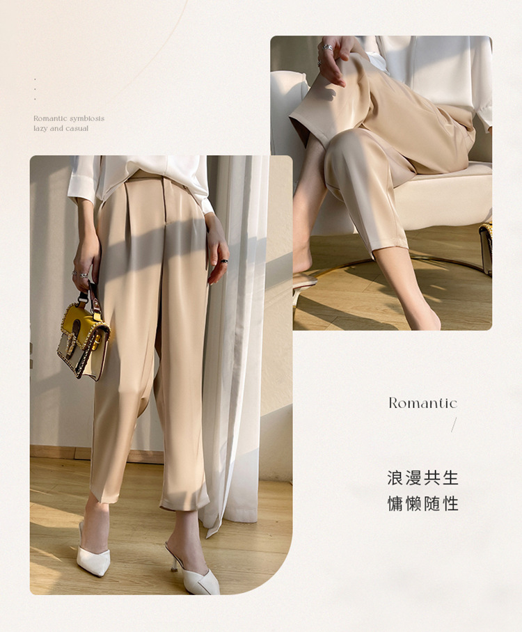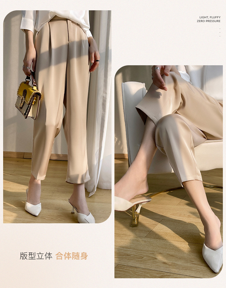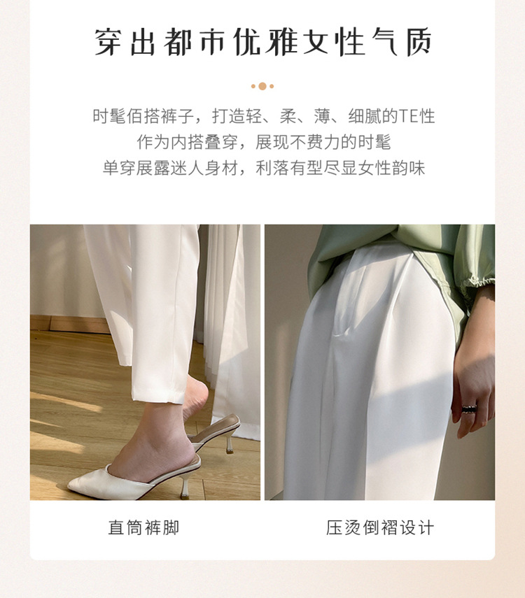 여름 얇은 Acetic Acid Silk 여성용 작은 반 탄성 미드 웨이스트 화이트 자른 세트 바지스토어 가기