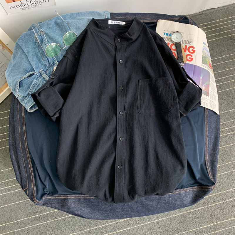 여름 옷깃 줄무늬 리넨 7 점 소매 셔츠 남자의 느슨한 7 점 소매 얇은 캐주얼 코튼 리넨 셔츠 트렌디스토어 가기