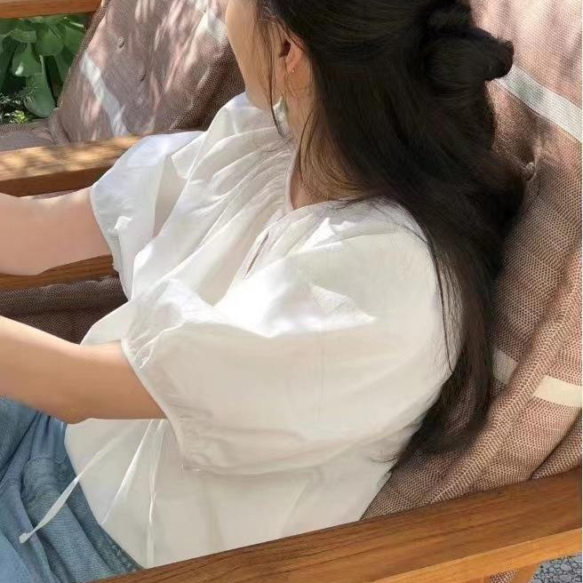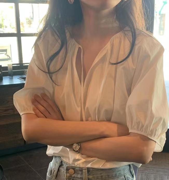 화이트 V 넥 퍼프 슬리브 셔츠 여성용 여름 얇은 반팔 쉬폰 셔츠 디자인 틈새