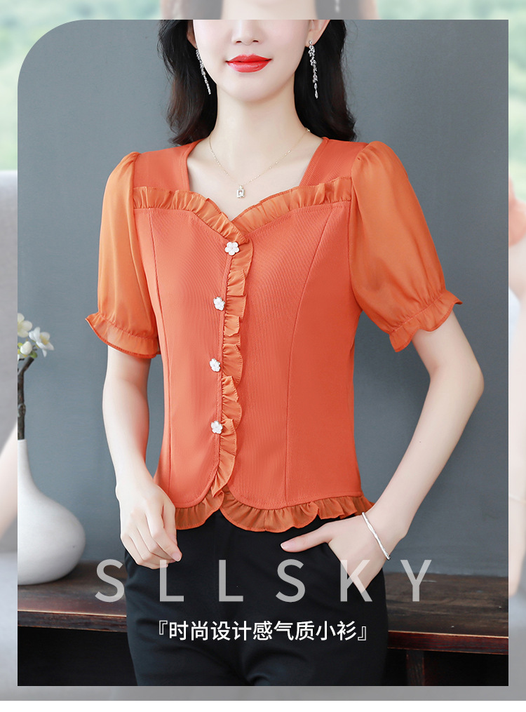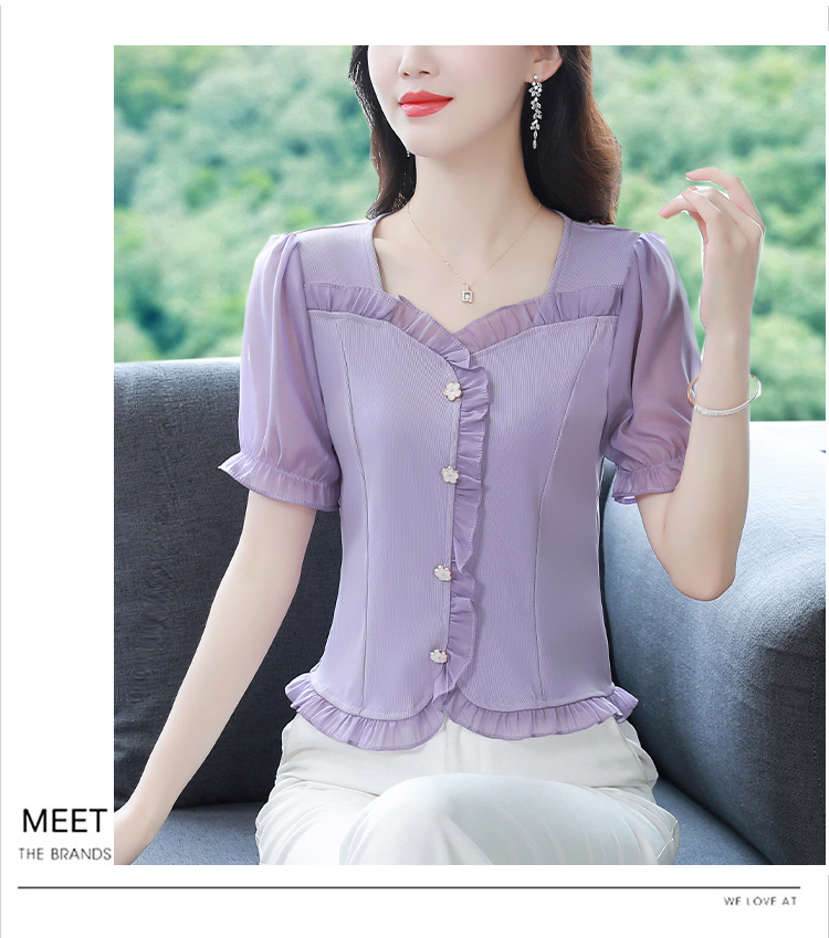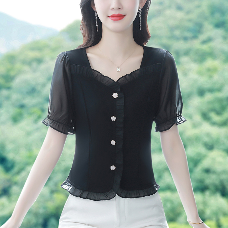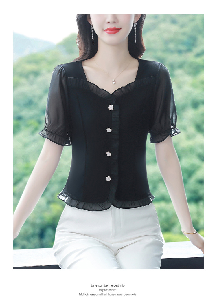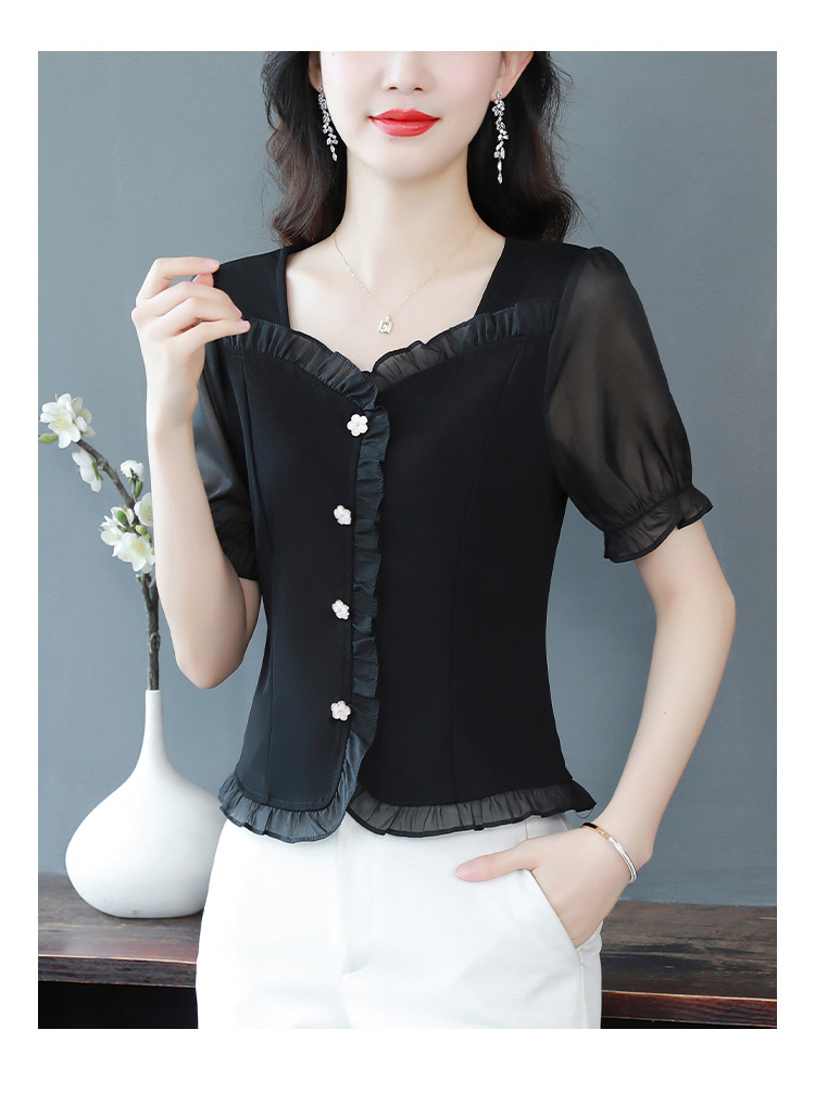 실제 샷 스팟 2024 여름 새로운 단색 레이스 스티칭 짧은 소매 기질 시대 감소 외국 스타일 슬림 핏 탑스토어 가기
