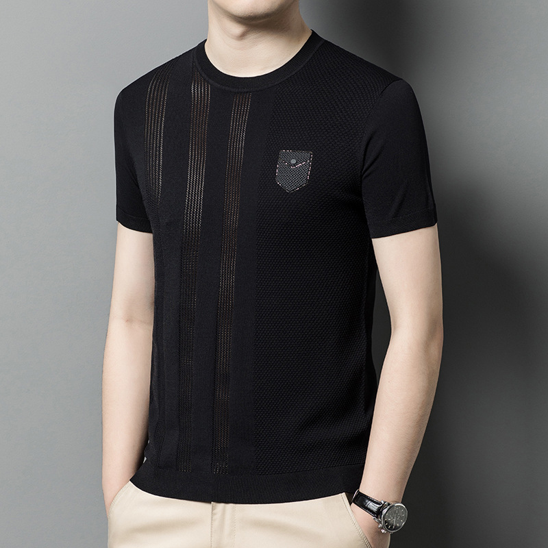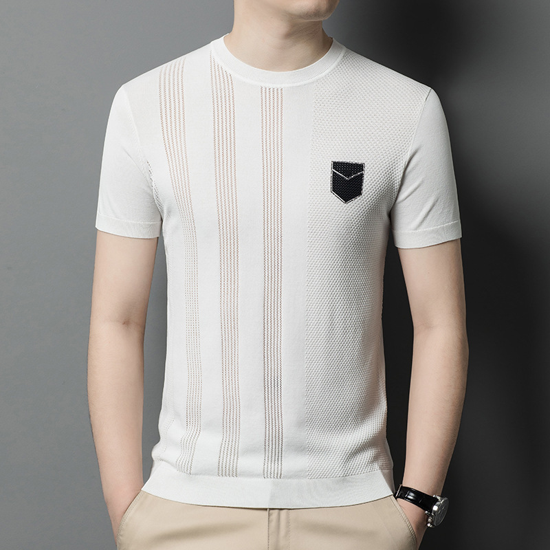 2024 년 여름 새로운 느슨한 캐주얼 남성 줄무늬 자수 중년 및 젊은 남성 반팔 티셔츠