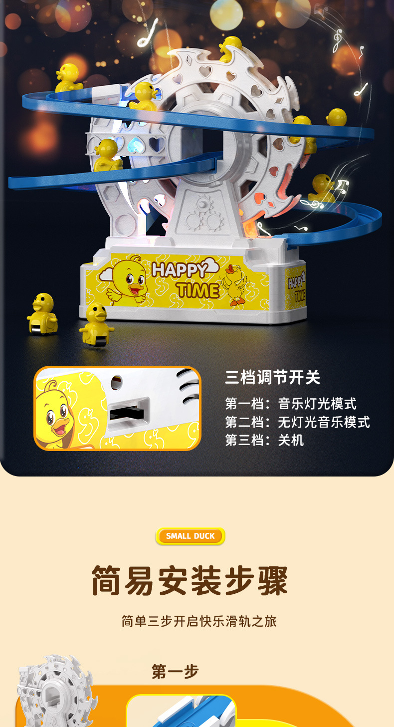 국경 새 색상 상자 작은 노란색 오리 관람차 전기 트랙 슬라이드 음악 조명 교육 조립 장난감