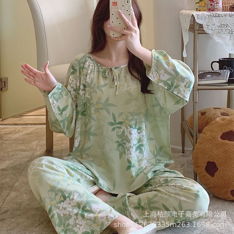 새로운 중국 스타일의 새로운 스타일 잠옷 봄 및 가을 여성 코튼 실크 세트 외부 착용을위한 편안한 긴팔 홈 의류 느슨한 큰 크기스토어 가기