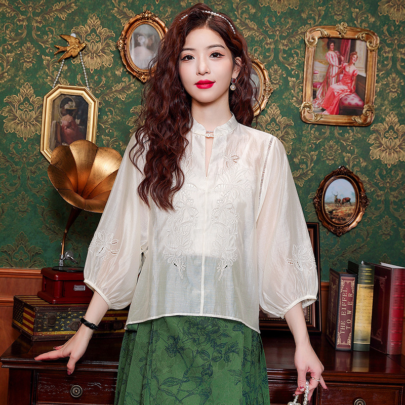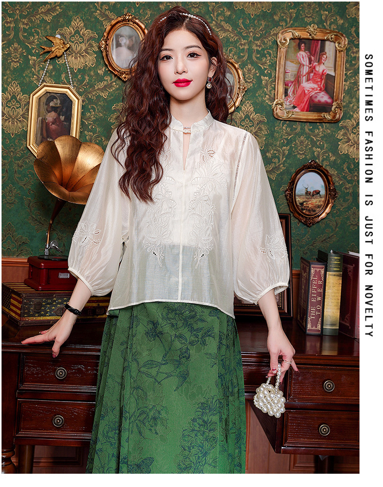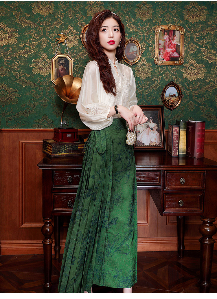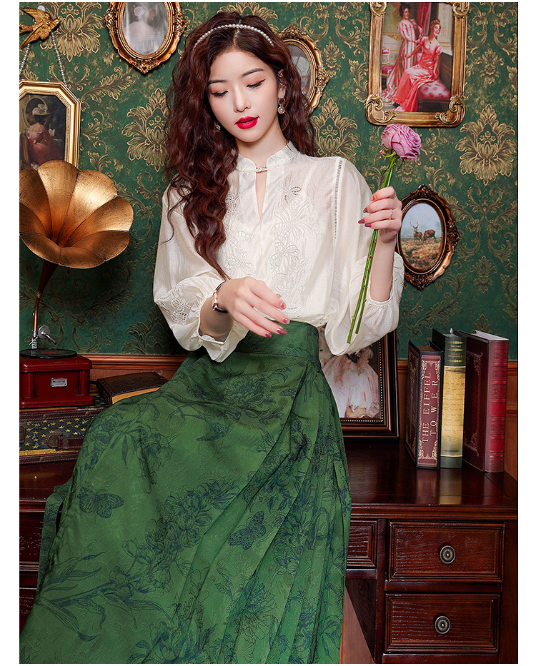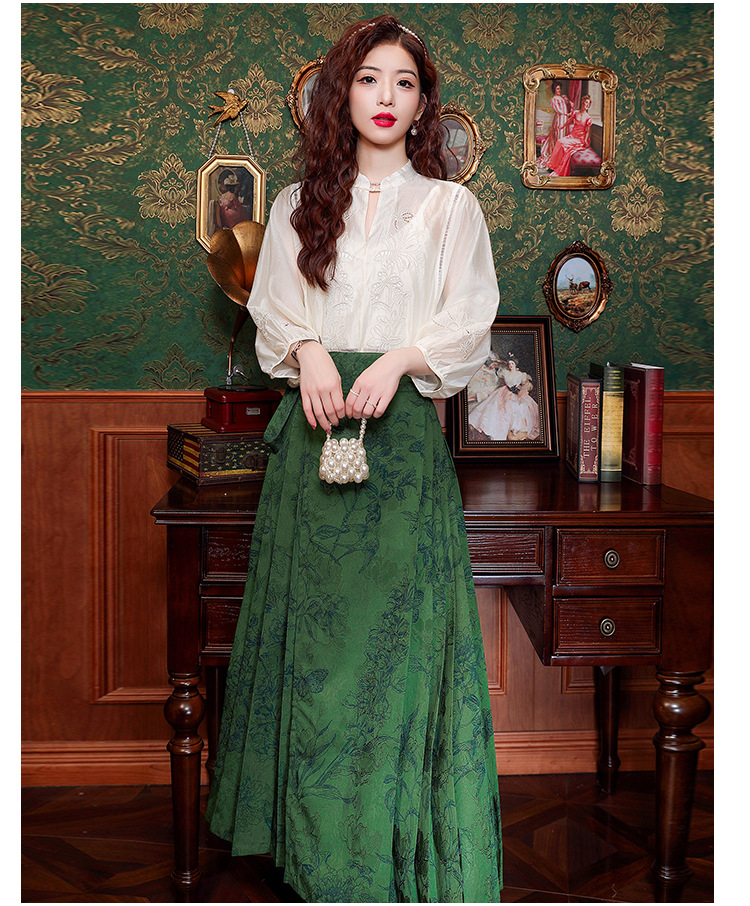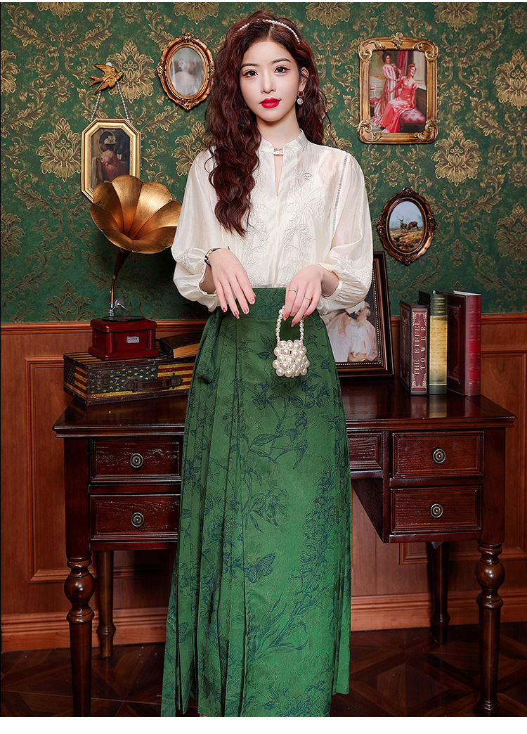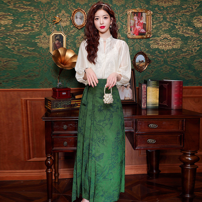 새로운 중국 스타일 국가 스타일 자수 탑 말 치마 셔츠 여성용 2024 새로운 중국 스타일 셔츠 말 얼굴 스커트 세트
