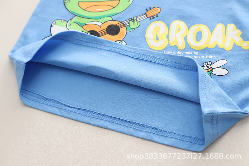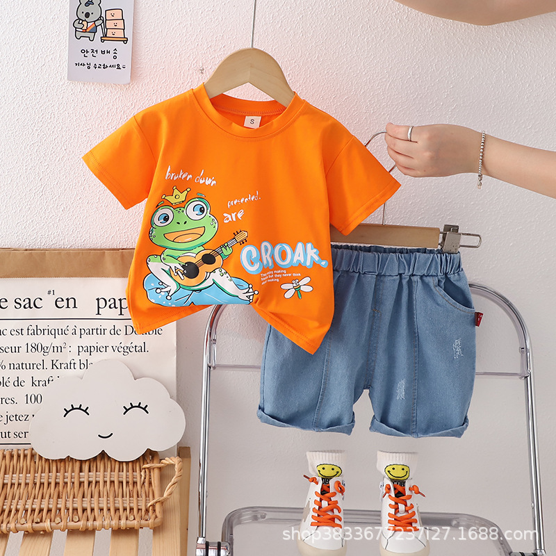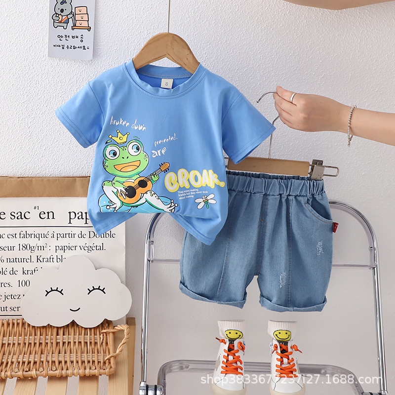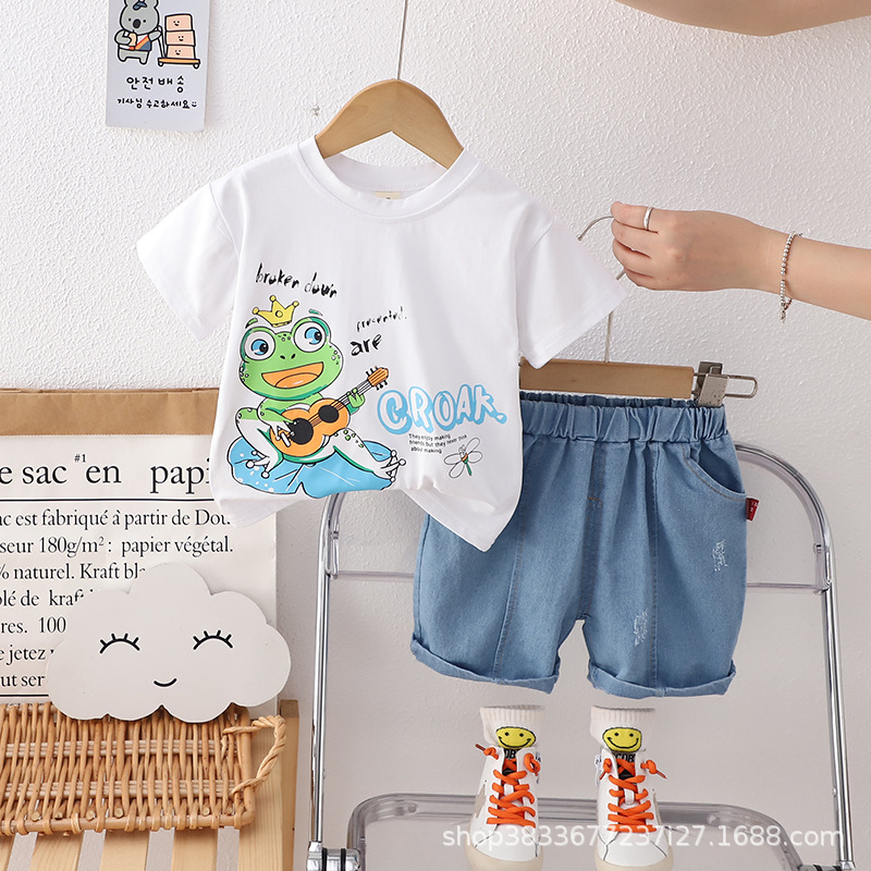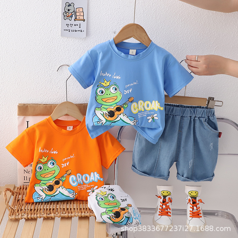 남자들의 여름 반팔 세트 신식 어린이 패션 중소형 어린이 튀긴 거리 개구리 왕자 반팔 세트 유행 머리스토어 가기